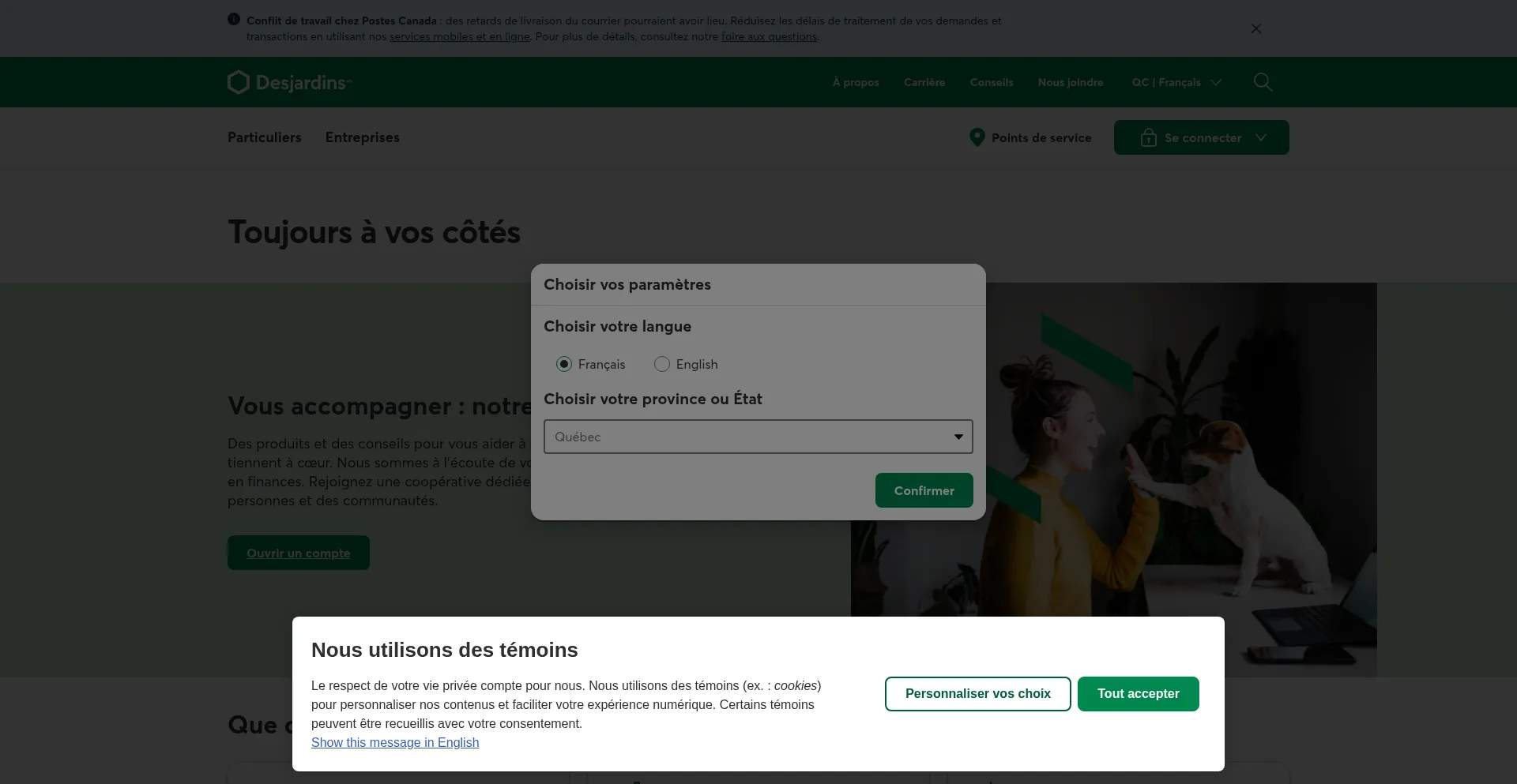 该网站实现符合GDPR或CCPA等隐私法规的cookie同意机制。这表明 desjardins.com 遵守数据保护标准并为用户提供对个人数据收集实践的控制。