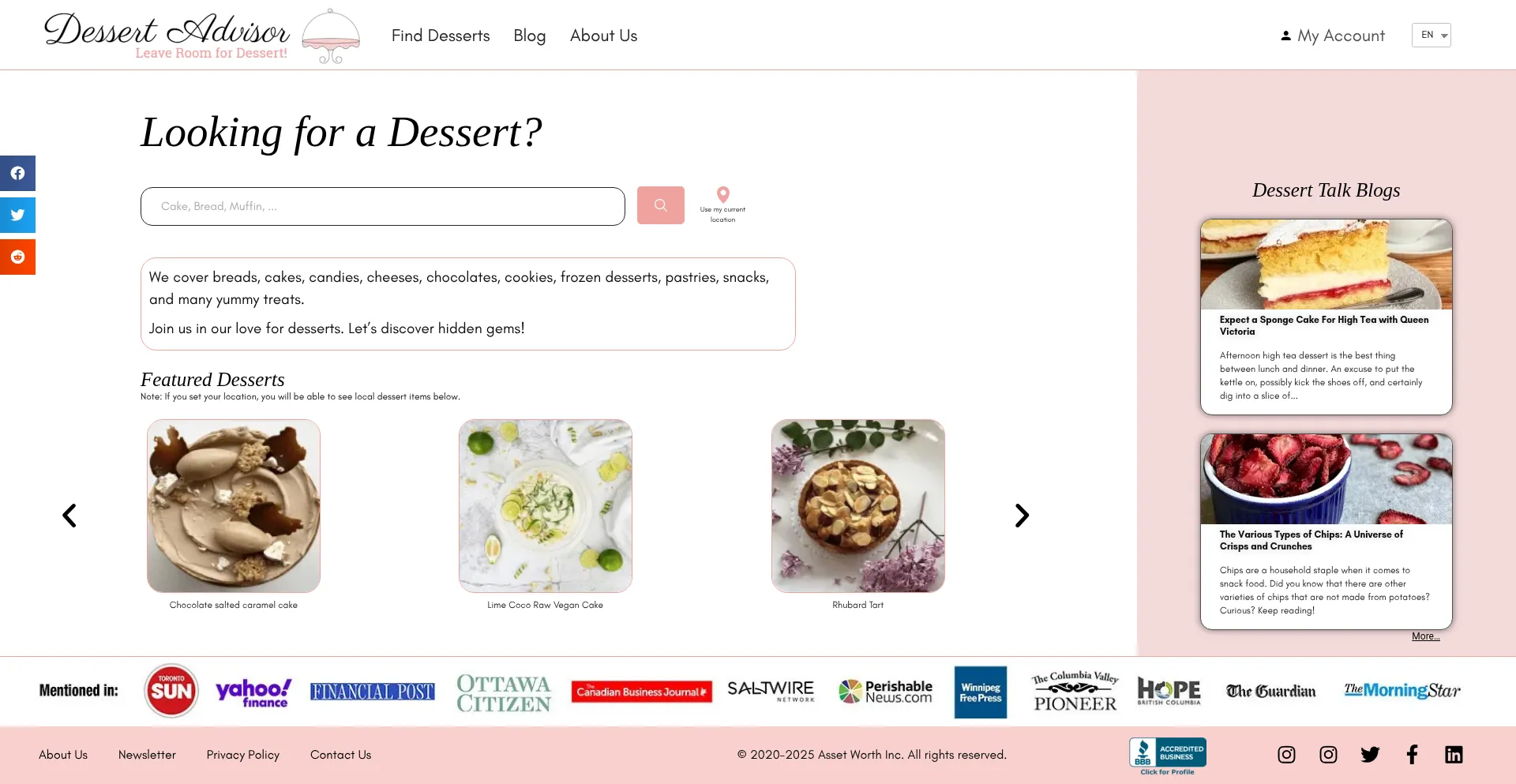 网站上存在社交媒体链接表明 dessertadvisor.com 在社交媒体上维护官方账户,这是可信度和参与度的积极信号。