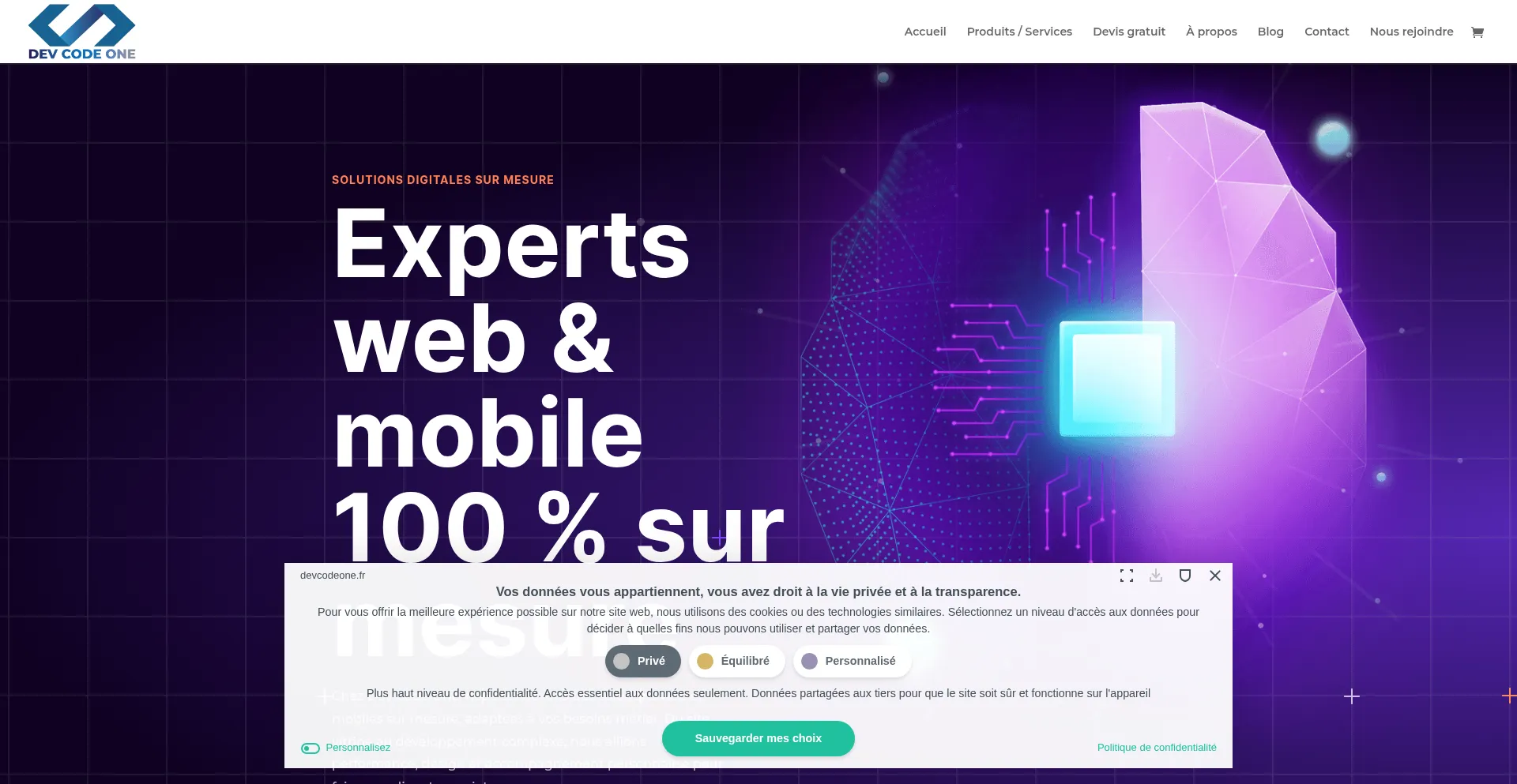Chez Dev Code One, nous concevons des solutions web et mobiles sur mesure, adaptées à vos besoins métier. Du site vitrine au développement complexe.
