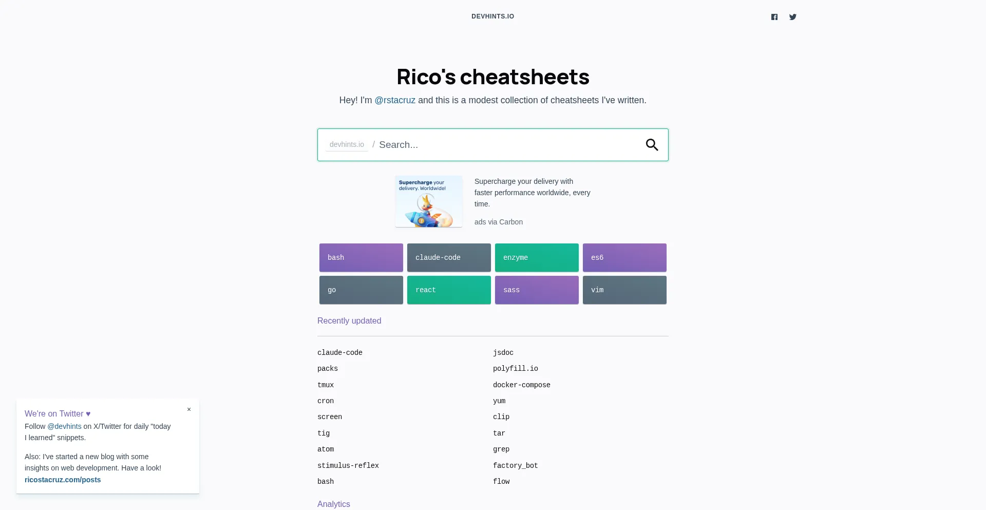 网站上存在社交媒体链接表明 devhints.io 在社交媒体上维护官方账户,这是可信度和参与度的积极信号。