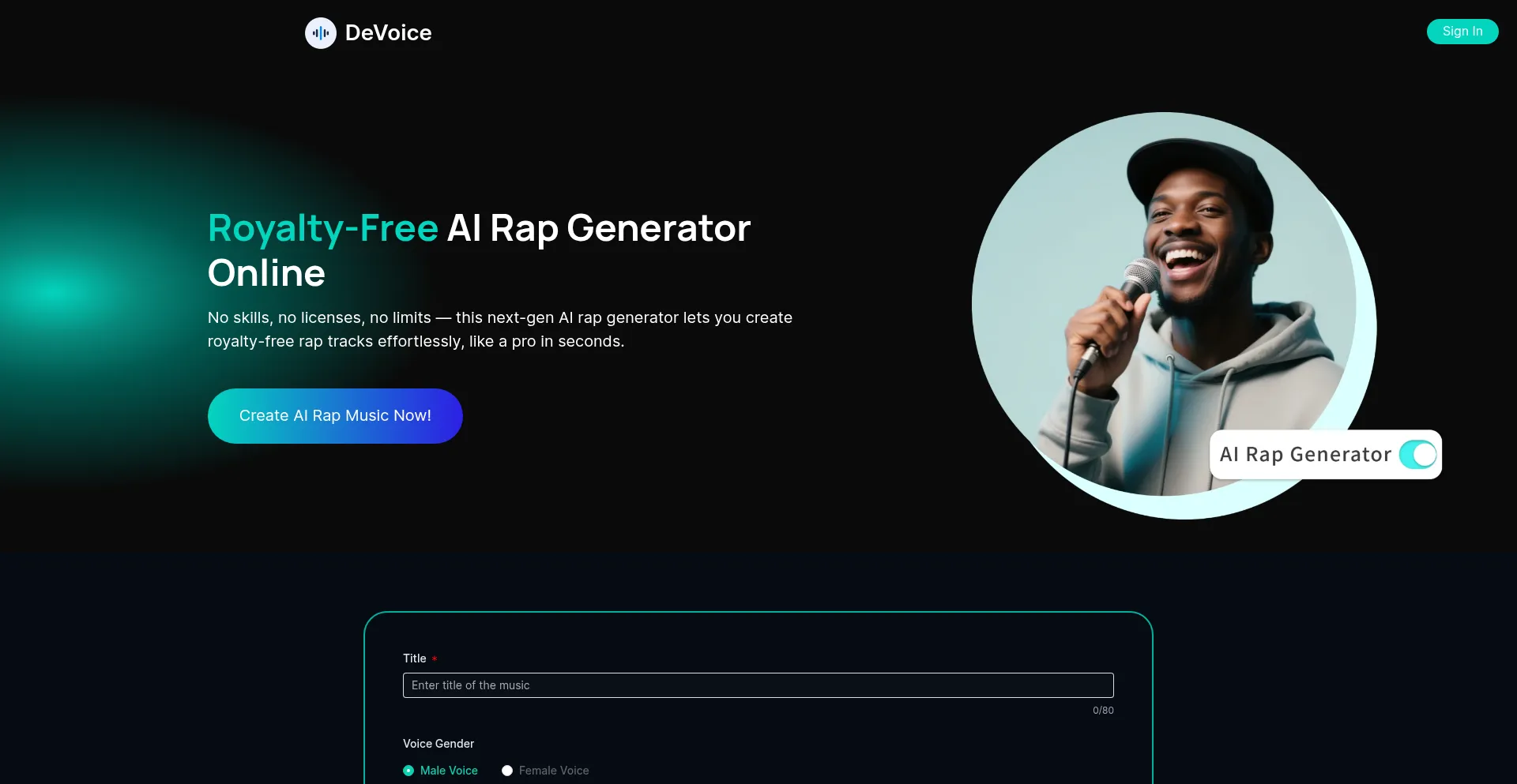 Create royalty-free rap tracks in seconds with DeVoice’s AI rap generator online free. Instantly turn lyrics to song using powerful AI voices and beats.