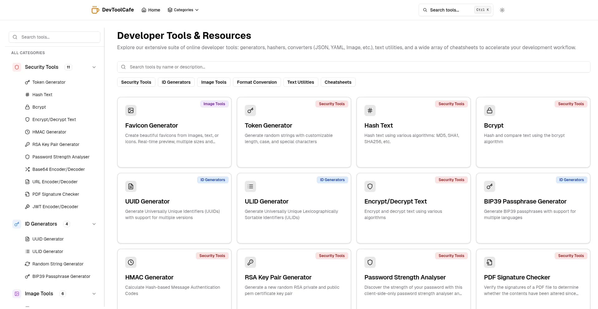 Explore a comprehensive collection of developer tools: token generators, hashers, converters, ID generators, image utilities, and various cheatsheets to streamline your workflow...