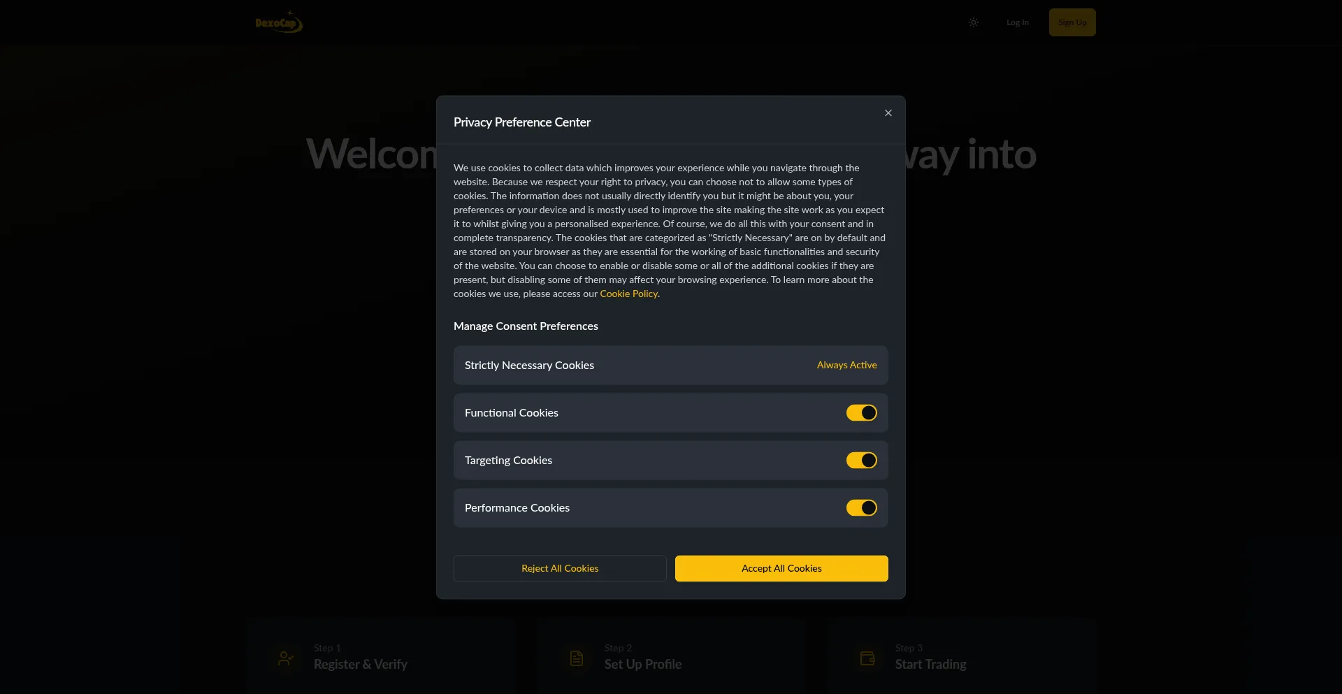 该网站实现符合GDPR或CCPA等隐私法规的cookie同意机制。这表明 dexocap.com 遵守数据保护标准并为用户提供对个人数据收集实践的控制。