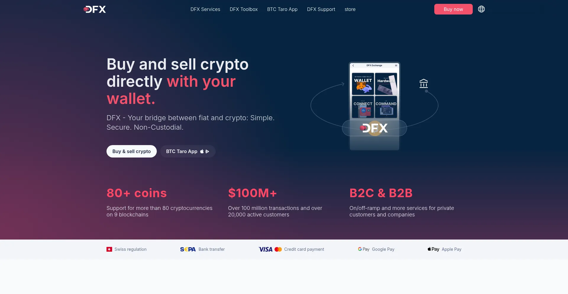 DFX is a non-custodial crypto on/off-ramp that lets you buy, sell, and swap 80+ coins directly from your bank account to your self-custody wallet.