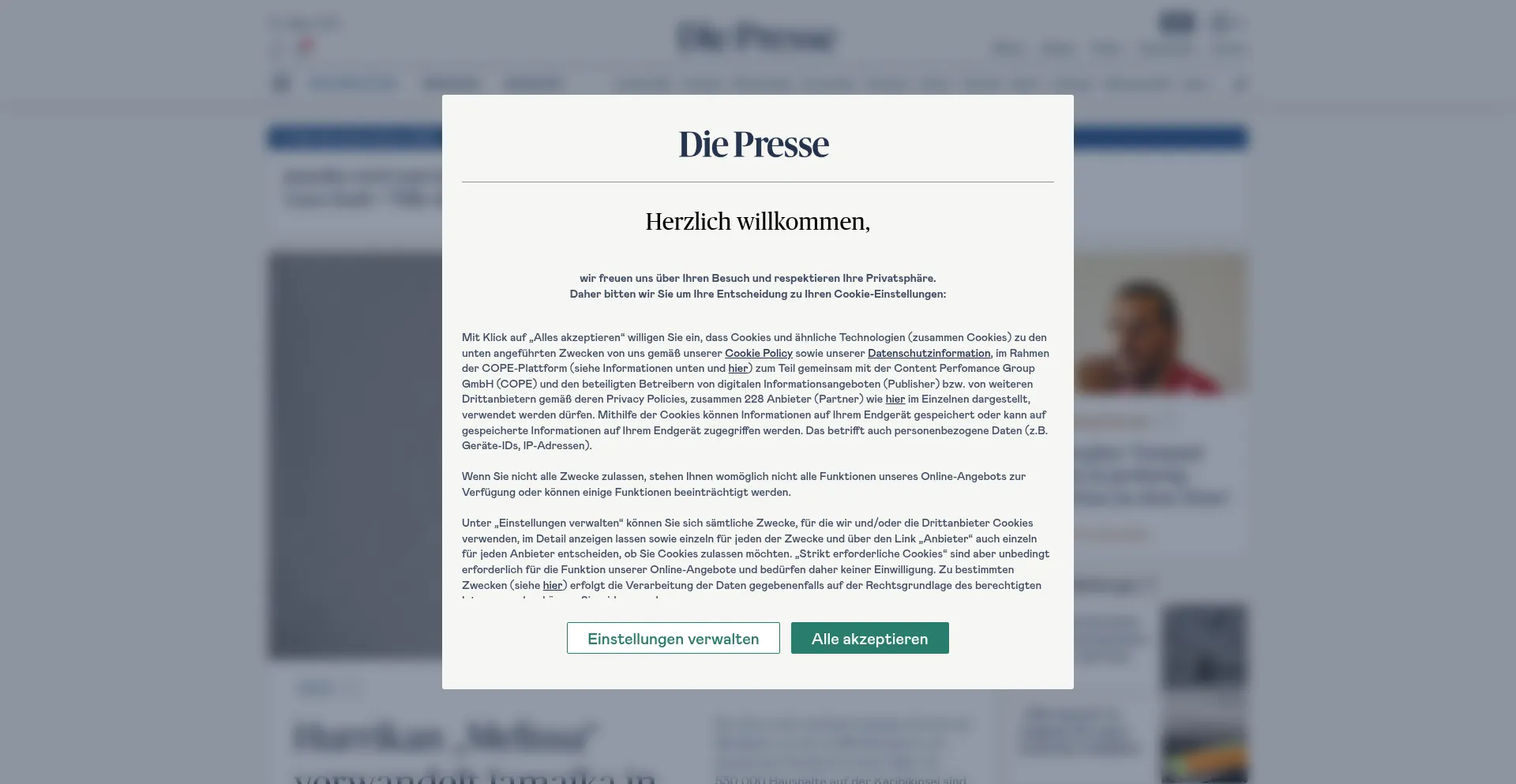 该网站实现符合GDPR或CCPA等隐私法规的cookie同意机制。这表明 diepresse.com 遵守数据保护标准并为用户提供对个人数据收集实践的控制。