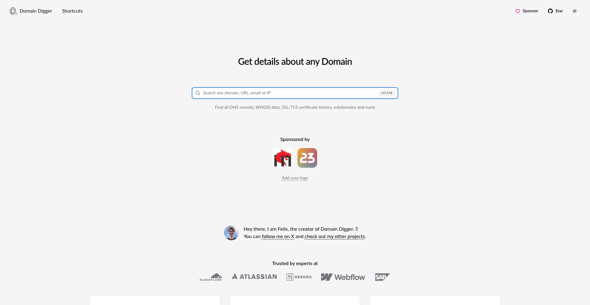 Domain Digger is the full open-source toolkit for next-level domain analysis, providing detailed DNS, IP, WHOIS data, and SSL/TLS history in a user-friendly, no-install interface.