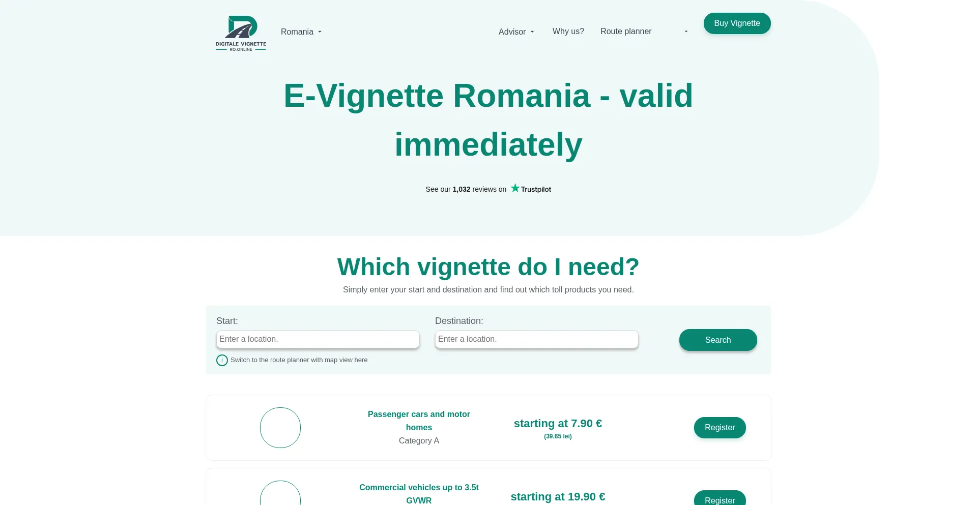 E-Vignette Romania fast & easy online: Car & Camper - 8,90 €, 0-3,5t - 13,90 €, 3,5t - 7,5t - 9,90 €. Valid instantly or desired date. No waiting period.