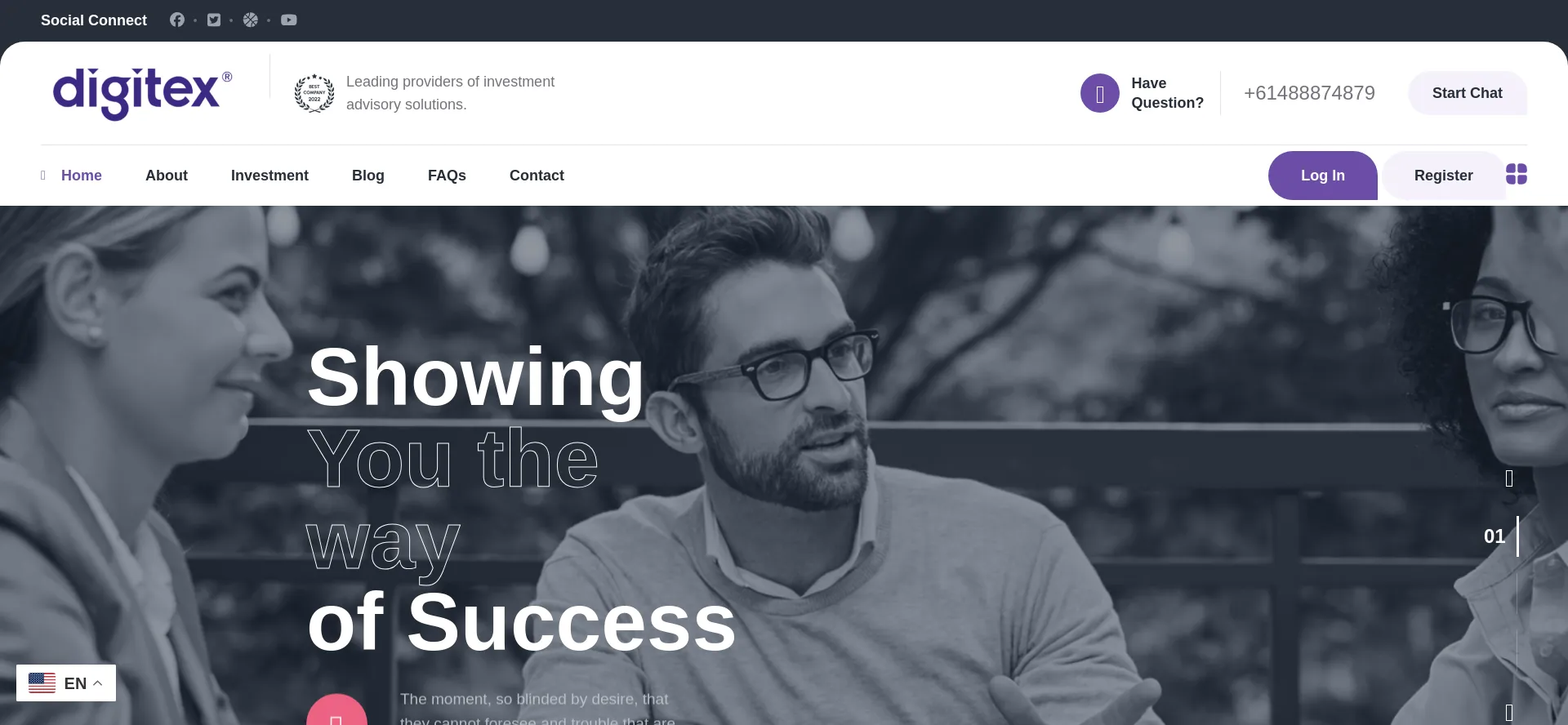 分析显示 digitexverse.com 显示社交媒体图标或链接,但不连接到合法的社交媒体档案。这种欺骗性做法通常用于创造虚假合法性,代表需要立即谨慎的欺诈意图的重要指标。
