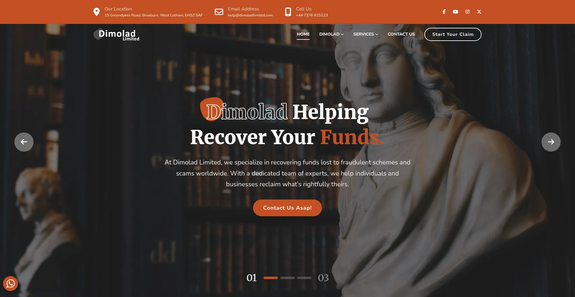 网站 dimoladlimited.com 宣传针对丢失或被盗资产的资金恢复服务。虽然一些在应急费用结构上运营,其他可能需要预付款,这可能表明欺诈运营。在聘请此类服务前验证凭据和监管合规性。