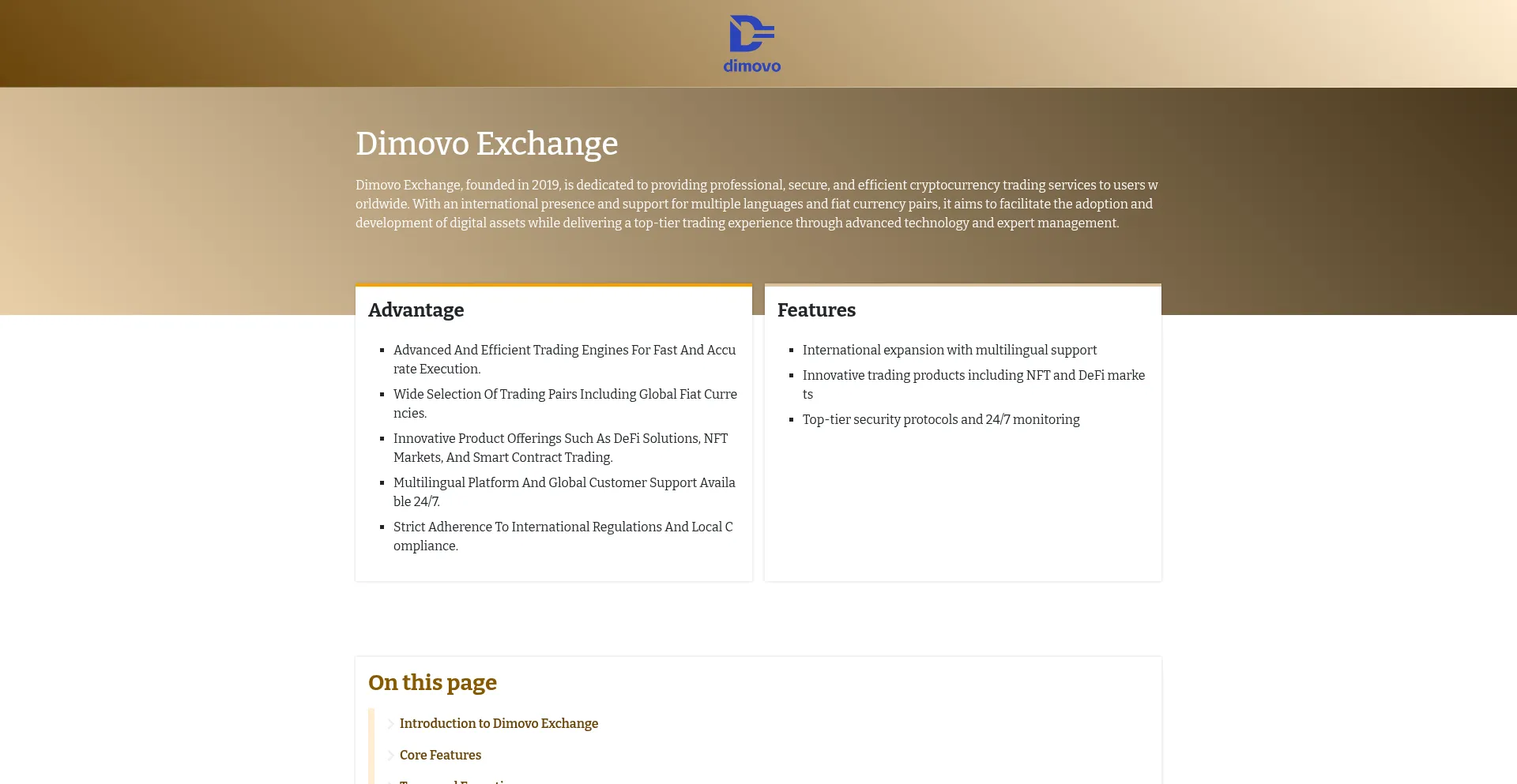 Dimovo Exchange, founded in 2019, provides professional, secure, and innovative cryptocurrency trading services worldwide, featuring advanced trading engines, DeFi and NFT marke...