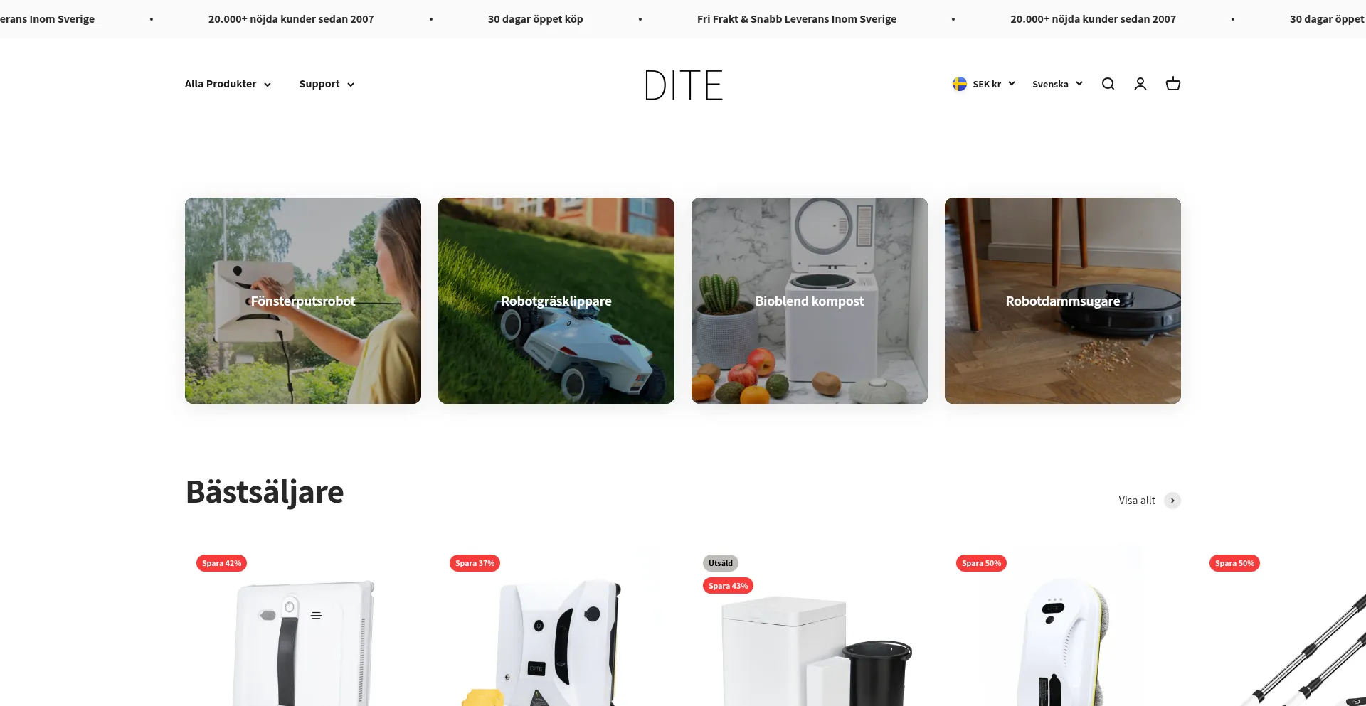 Dite.nu grundades 2007 och är en etablerad aktör inom branschen. Vi kan erbjuda de senaste innovationerna inom robotdammsugare, robotgräsklippare och fönsterputsrobot. Vi Ga...