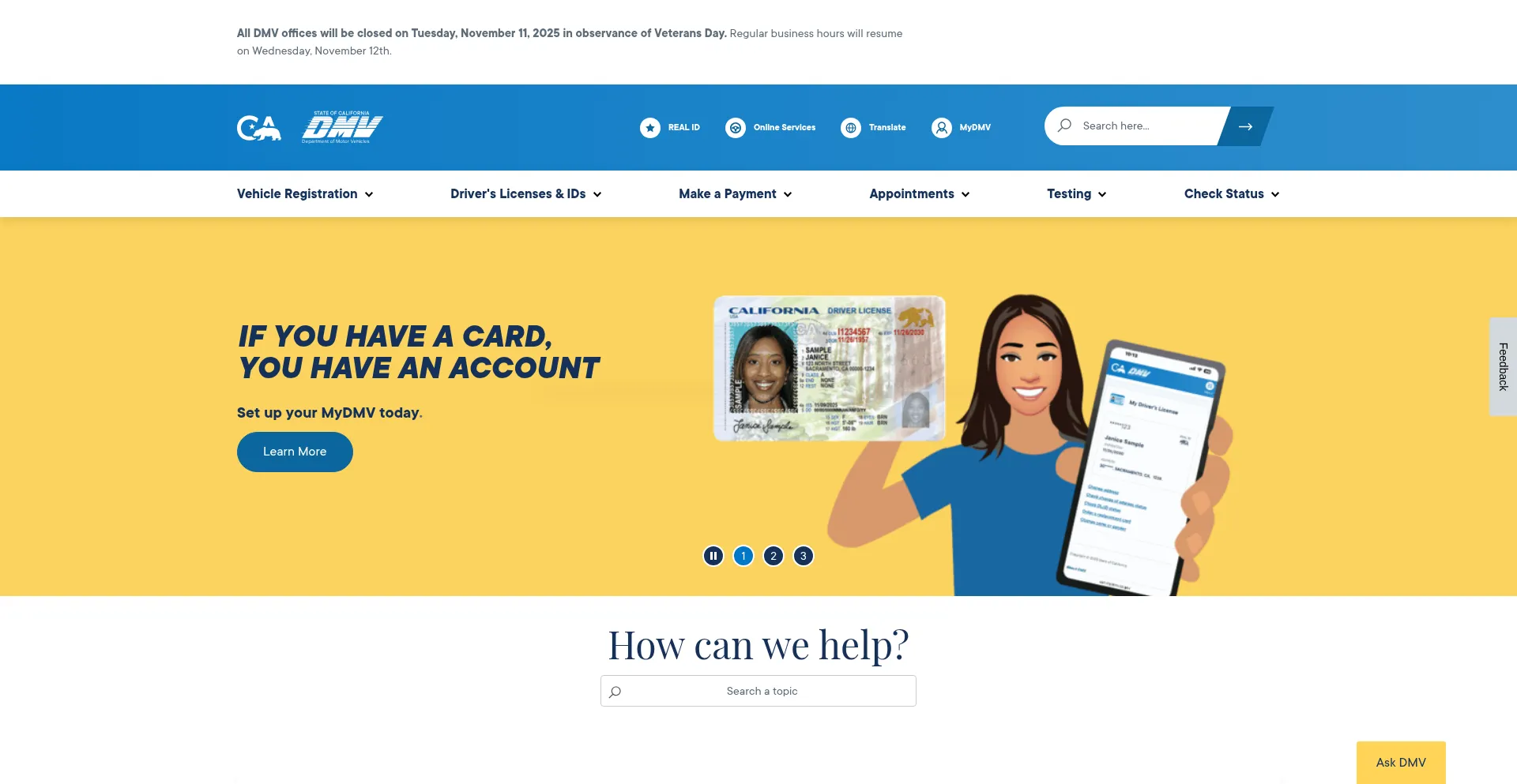 California Department of Motor Vehicles (DMV) - apply for a REAL ID, register a vehicle, renew a driver's license, and more.