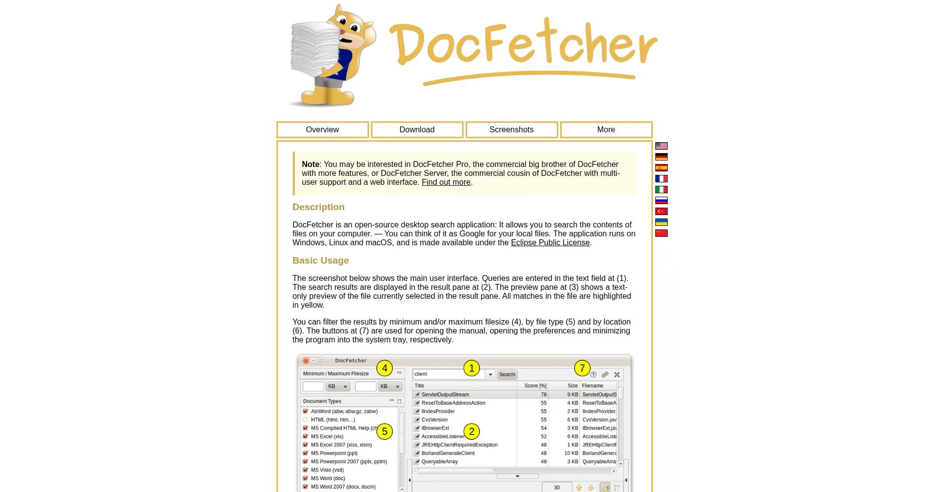 Homepage of DocFetcher, a desktop search application for fast document retrieval