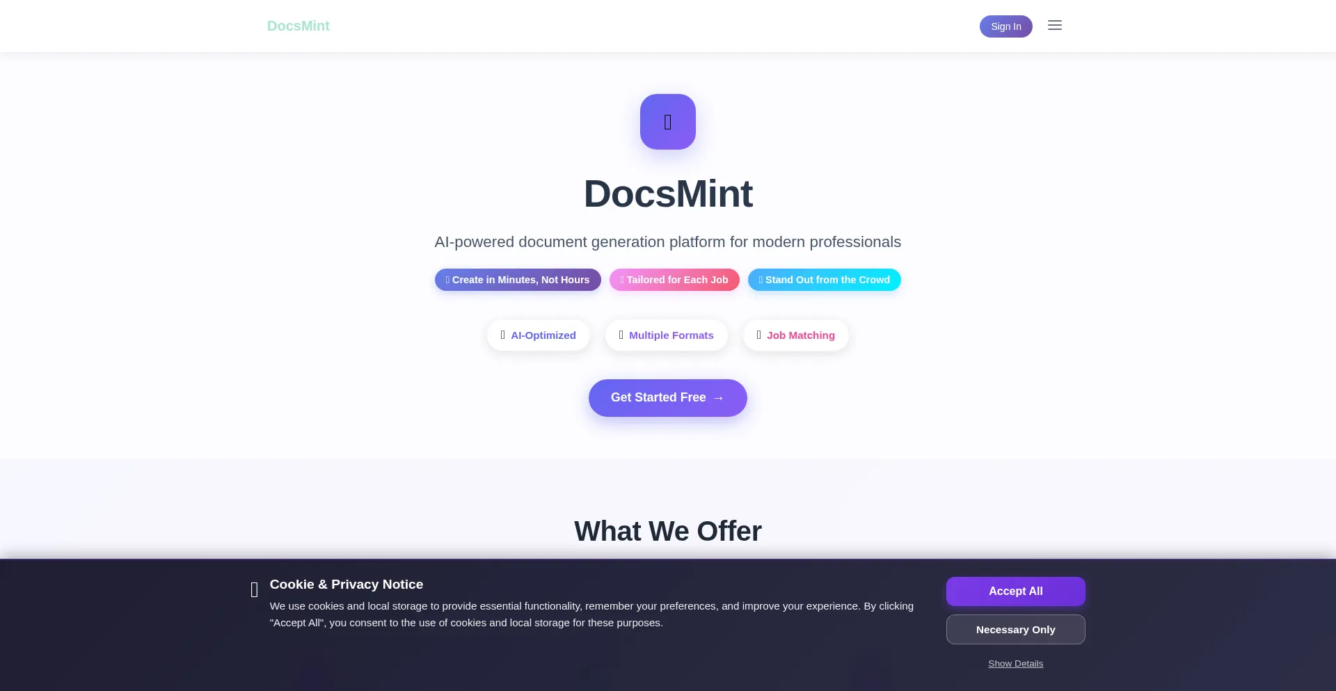 该网站实现符合GDPR或CCPA等隐私法规的cookie同意机制。这表明 docsmint.com 遵守数据保护标准并为用户提供对个人数据收集实践的控制。