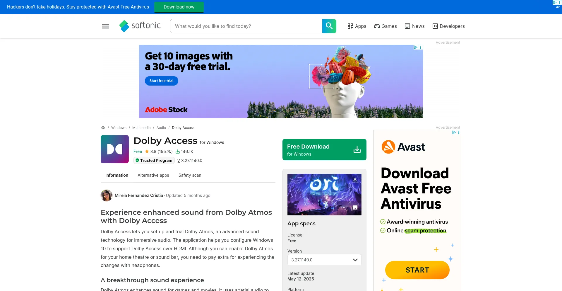 网站上存在社交媒体链接表明 dolby-access.en.softonic.com 在社交媒体上维护官方账户,这是可信度和参与度的积极信号。