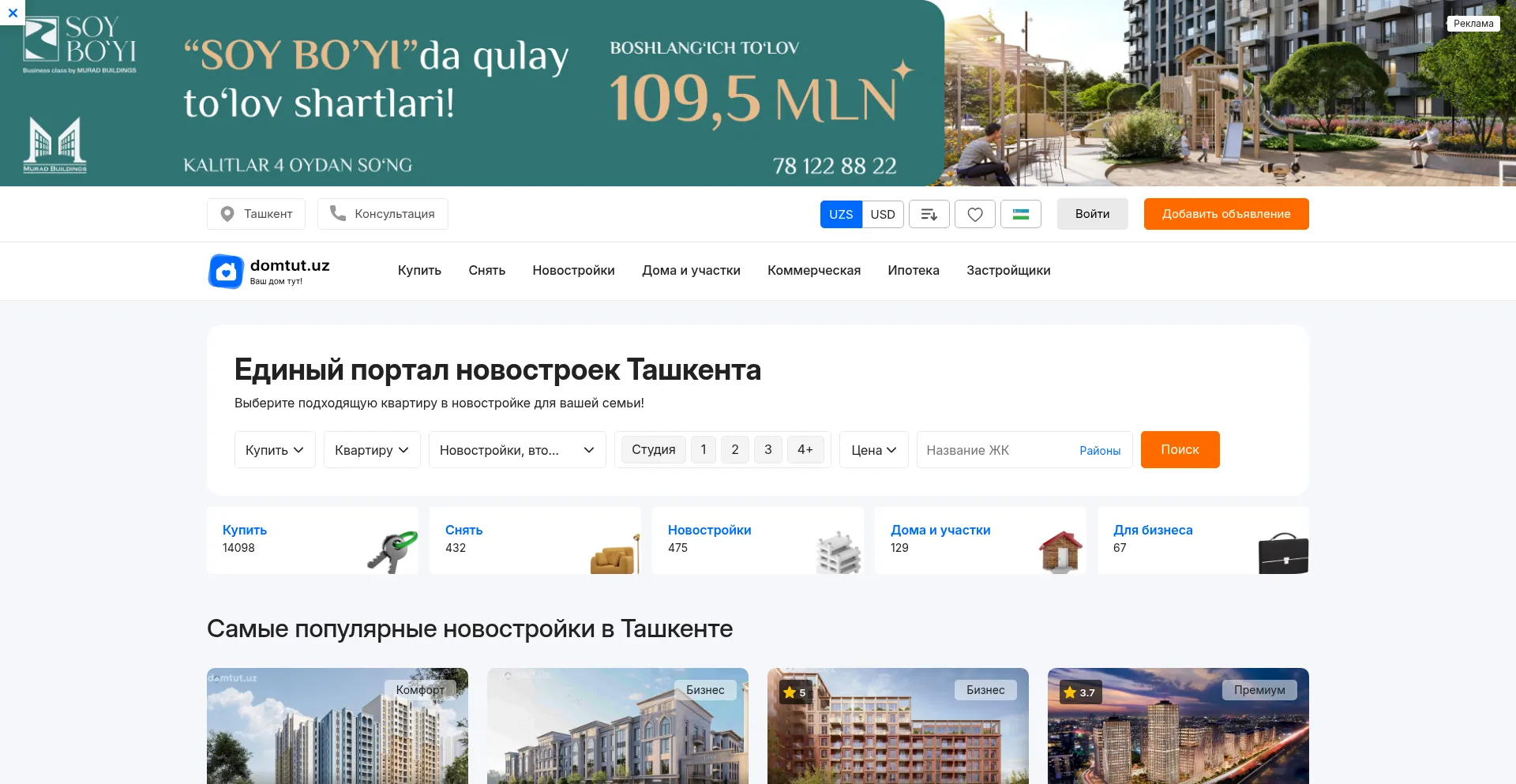 domtut.uz 提供 Android 设备移动应用程序,表明平台存在已扩展到网络服务之外。