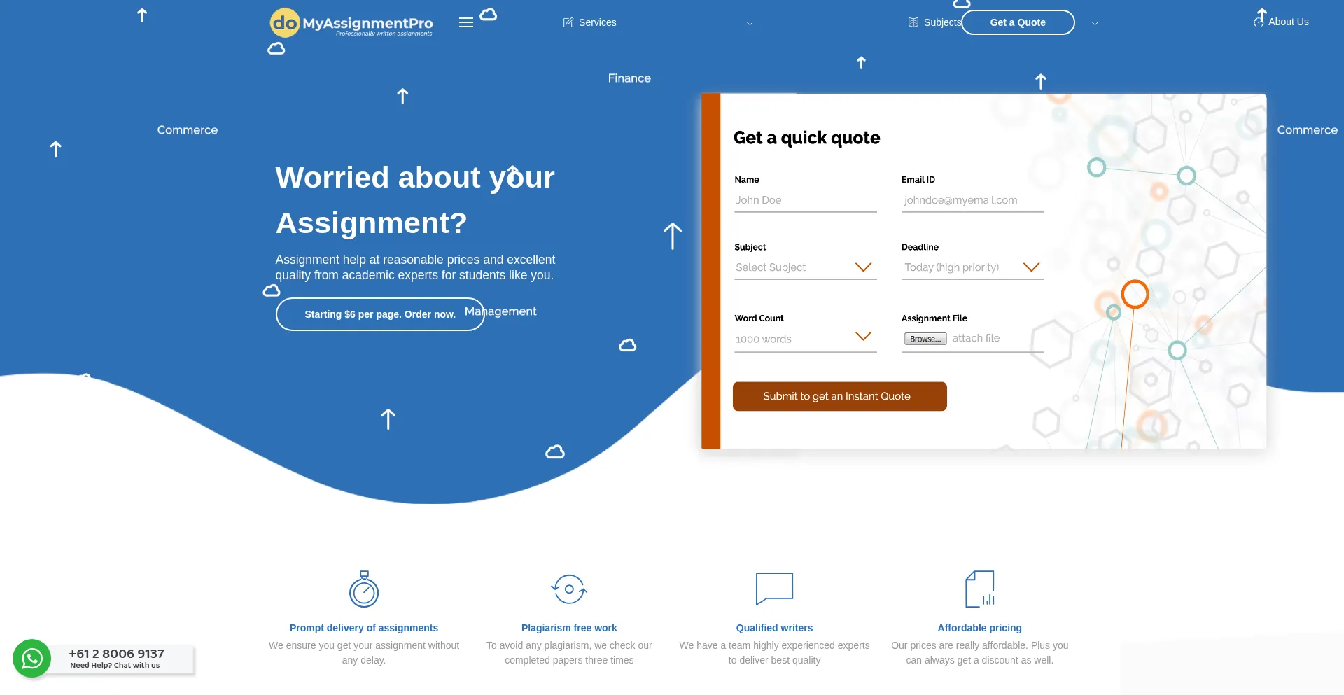 分析表明 domyassignmentpro.com 作为电子商务平台运营,促进商品或服务的在线交易。该网站实现了购物车功能、支付处理系统和产品目录功能,这些是商业零售运营的典型特征。