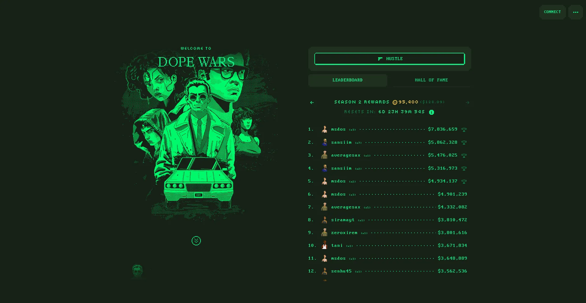 Dope Wars is an onchain adaptation of the classic arbitrage game Drug Wars, built by Cartridge in partnership with Dope DAO