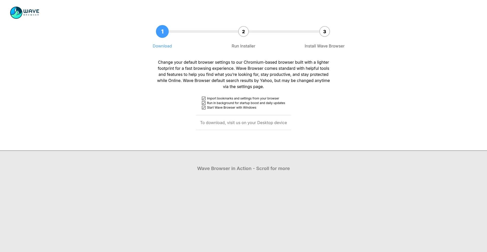 网站 download.wavebrowser.co 被配置为一个带有移动应用功能的网络应用。用户可以直接将该网站安装到设备的桌面上,以快速访问并享受类似移动应用的体验。