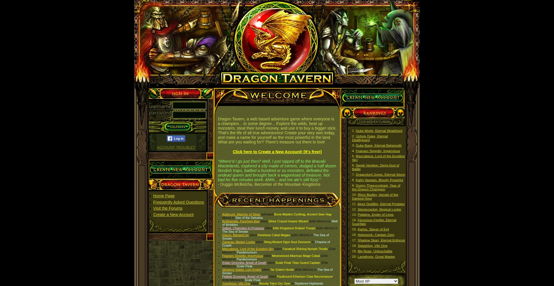 Dragon Tavern, a web based adventure game where everyone is a champion.. to some degree.. Explore the wilds, beat up monsters, steal their lunch money, and use it to buy a bigge...