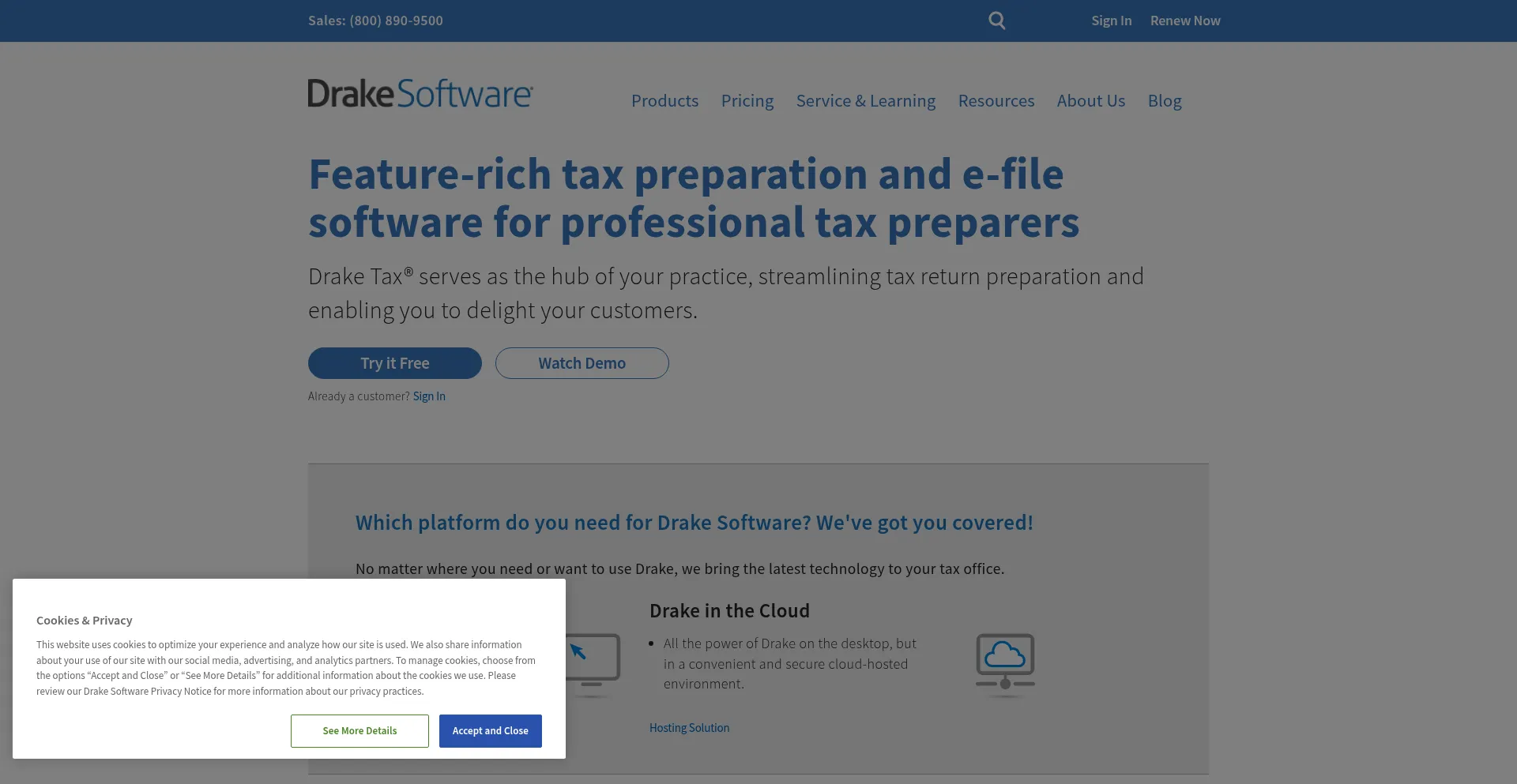 该网站实现符合GDPR或CCPA等隐私法规的cookie同意机制。这表明 drakesoftware.com 遵守数据保护标准并为用户提供对个人数据收集实践的控制。