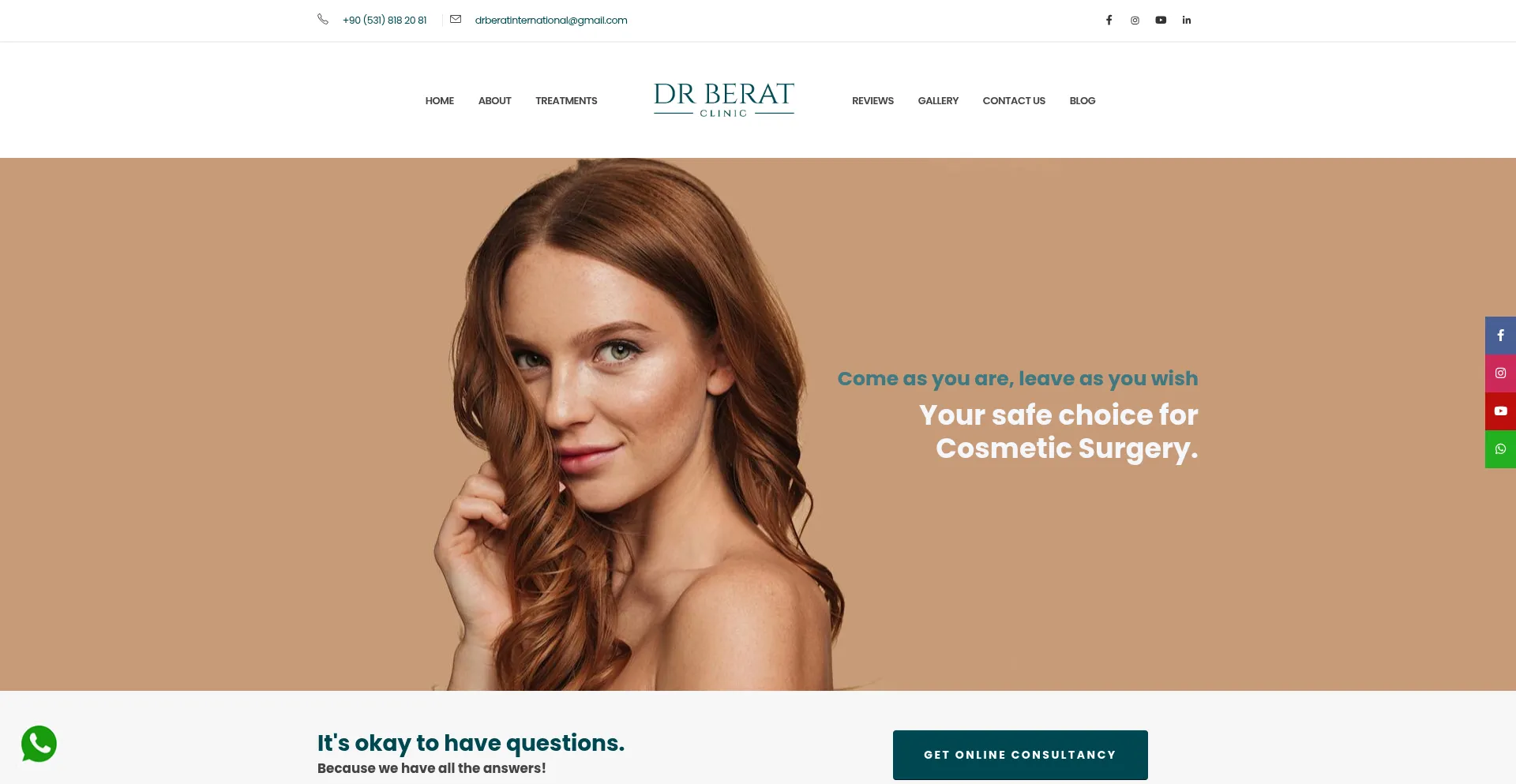 网站上存在社交媒体链接表明 drberatclinic.com 在社交媒体上维护官方账户,这是可信度和参与度的积极信号。