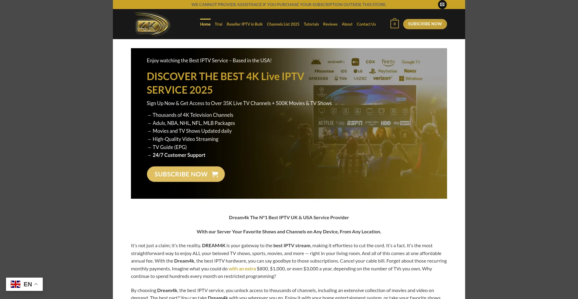 4K live IPTV UK subscription from Dream4k server for Smart TV, Firestick, Mag, Apple Tv, Android.. Our best IPTV services are available on all major devices.