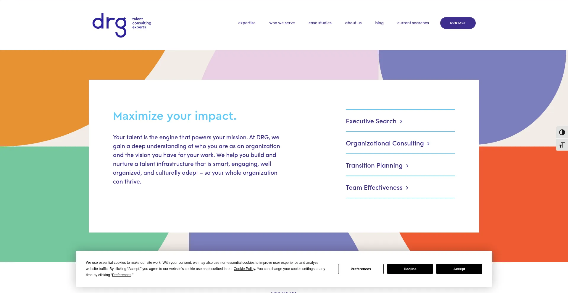 该网站实现符合GDPR或CCPA等隐私法规的cookie同意机制。这表明 drgtalent.com 遵守数据保护标准并为用户提供对个人数据收集实践的控制。