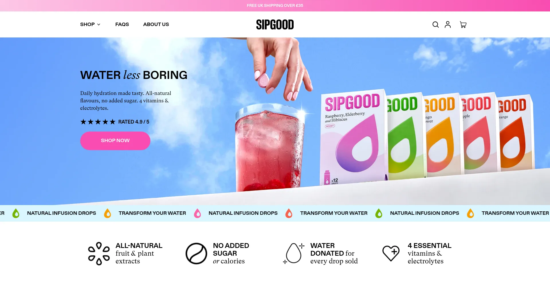Water less boring. Sipgood Natural Infusion Drops transform your water. All-natural fruit flavours, real plant extracts, no added sugar, 4 essential vitamins & electrolytes. Plu...