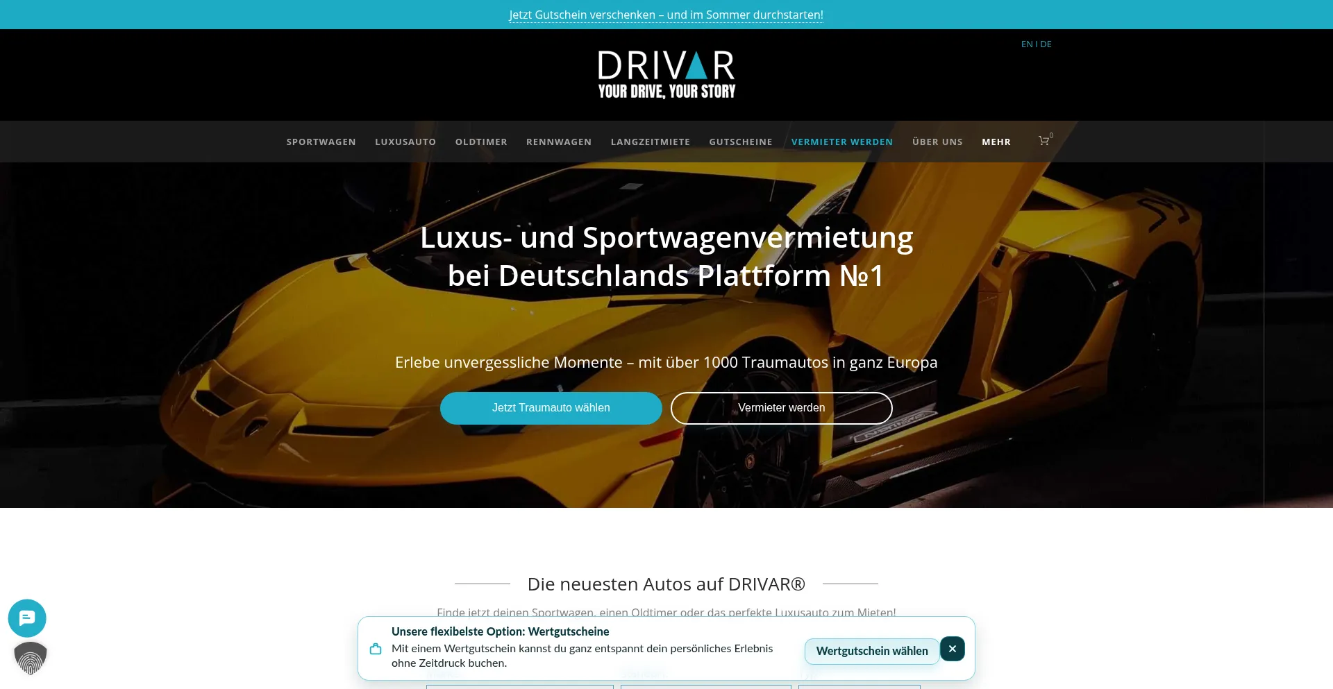 Sportwagenvermietung DRIVAR® > 1.000 Autos in ganz Deutschland ✔️ Alle Marken ✔️ Alle Städte ✔️ Auch als Gutschein ✔️ Jetzt entdecken!