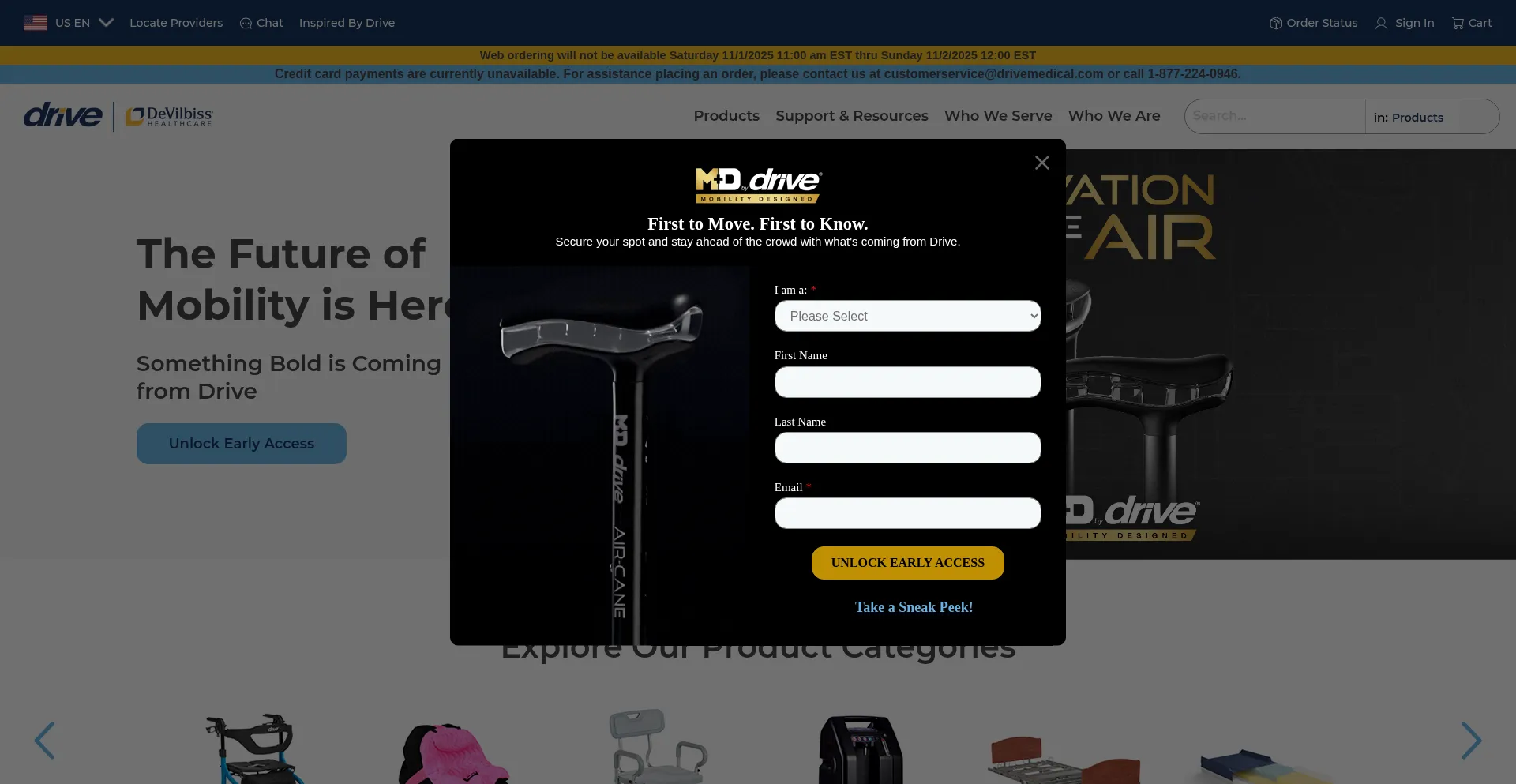 该网站实现数据收集表单,请求个人信息,包括姓名、电子邮件地址、电话号码或其他敏感详细信息。用户应验证 drivemedical.com 的合法性并在提交个人数据前查看隐私政策。