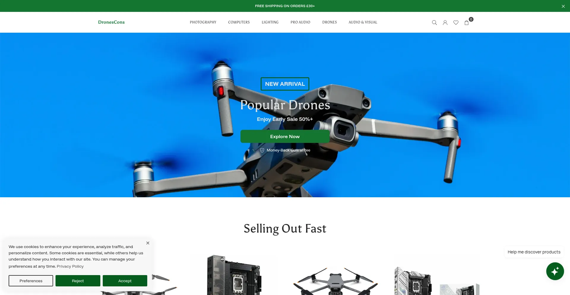 该网站利用流行产品名称和品牌来吸引流量并产生用户兴趣。这些产品可能通过促销活动或折扣策略提供,旨在增加 dronescons.com 的访客参与度和转化率。