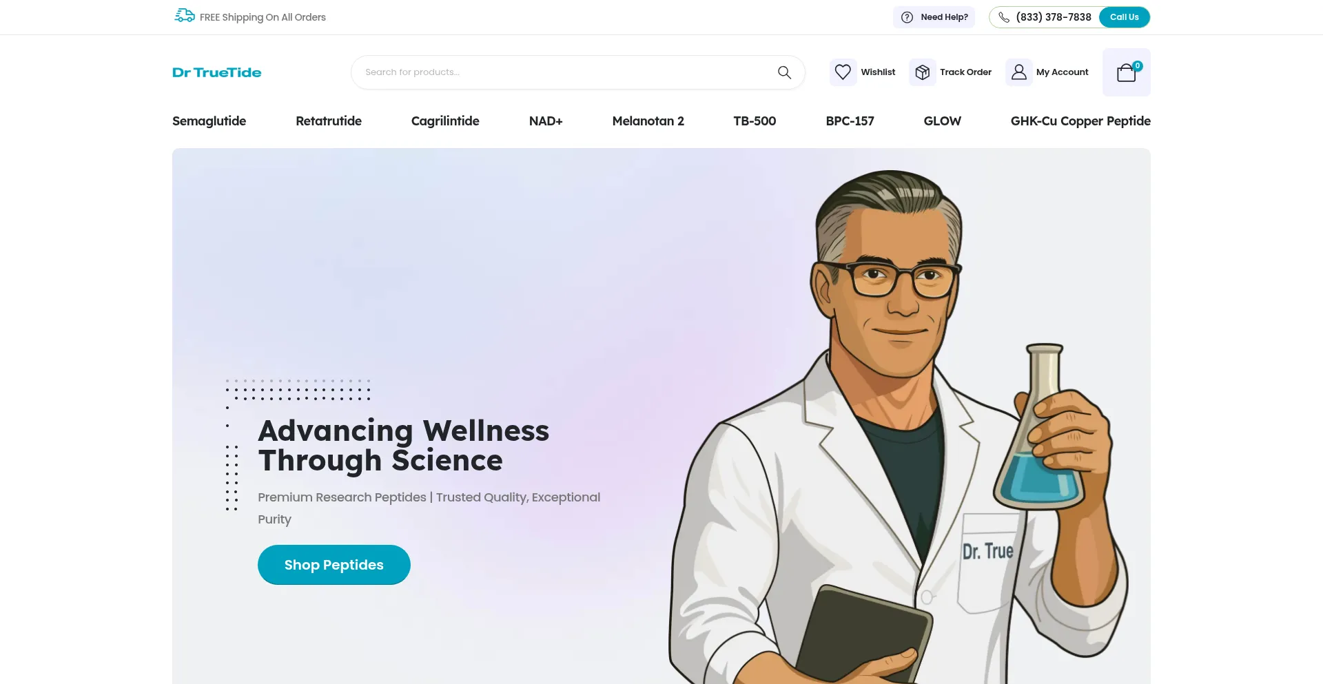 分析表明 drtruetide.com 作为电子商务平台运营,促进商品或服务的在线交易。该网站实现了购物车功能、支付处理系统和产品目录功能,这些是商业零售运营的典型特征。