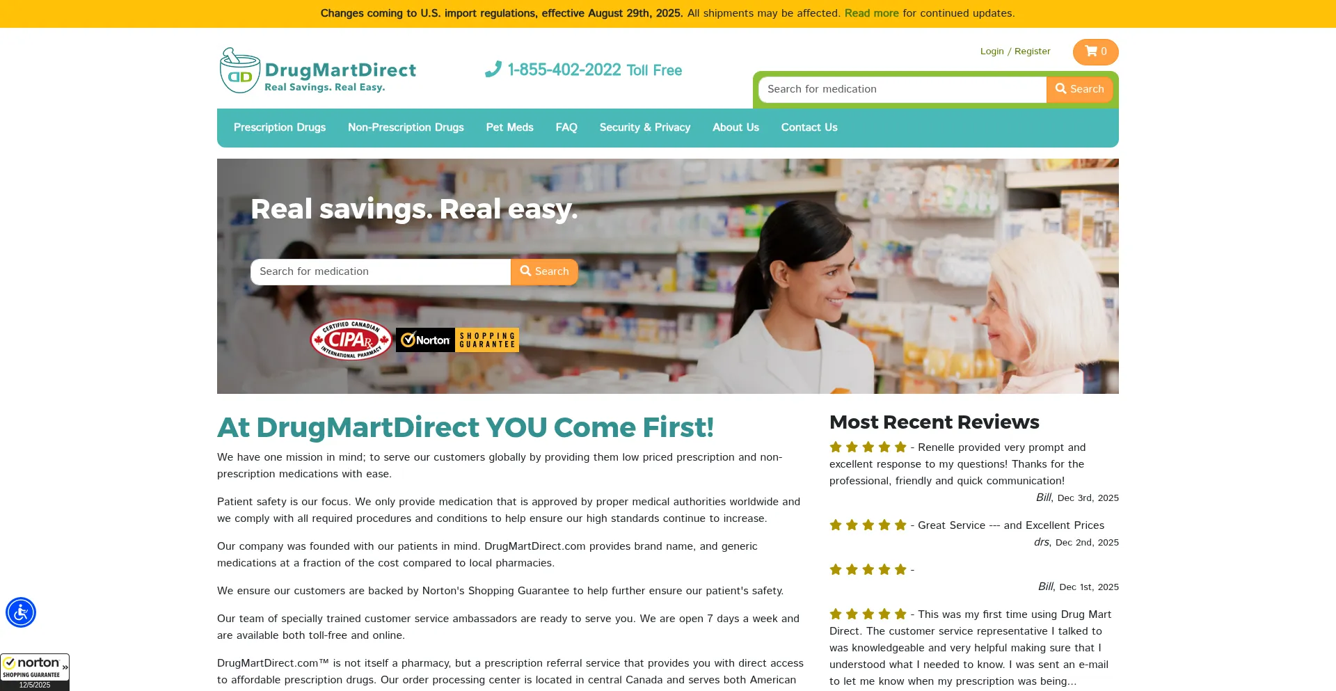 该网站实现数据收集表单,请求个人信息,包括姓名、电子邮件地址、电话号码或其他敏感详细信息。用户应验证 drugmartdirect.com 的合法性并在提交个人数据前查看隐私政策。