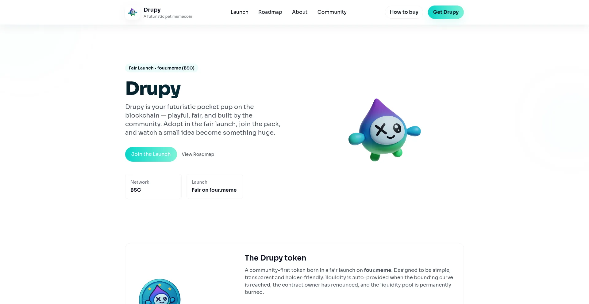Drupy — futuristic meme pet memecoin. Fair launch on four.meme, PancakeSwap listing, and a 100-item NFT drop.