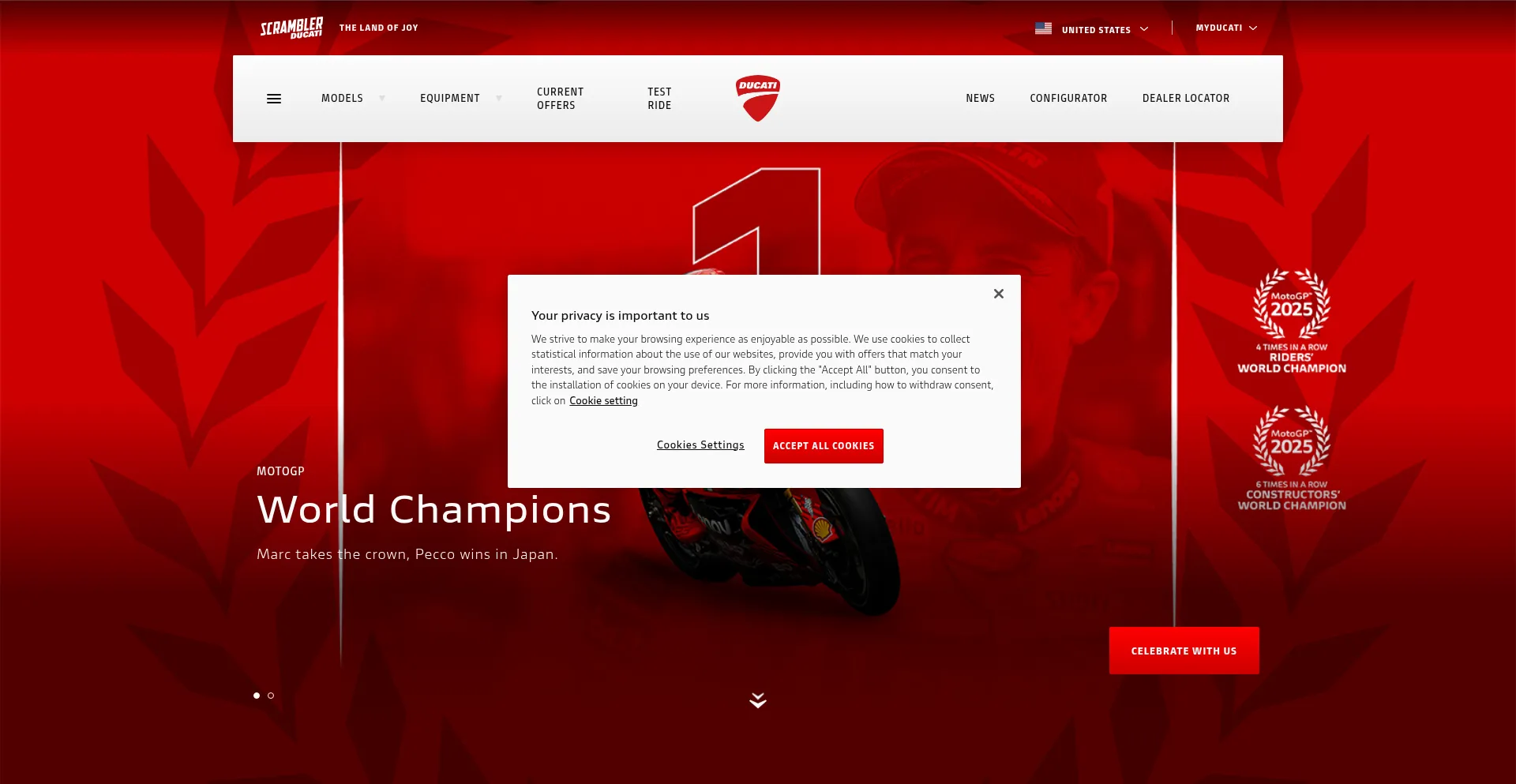 该网站实现符合GDPR或CCPA等隐私法规的cookie同意机制。这表明 ducati.com 遵守数据保护标准并为用户提供对个人数据收集实践的控制。