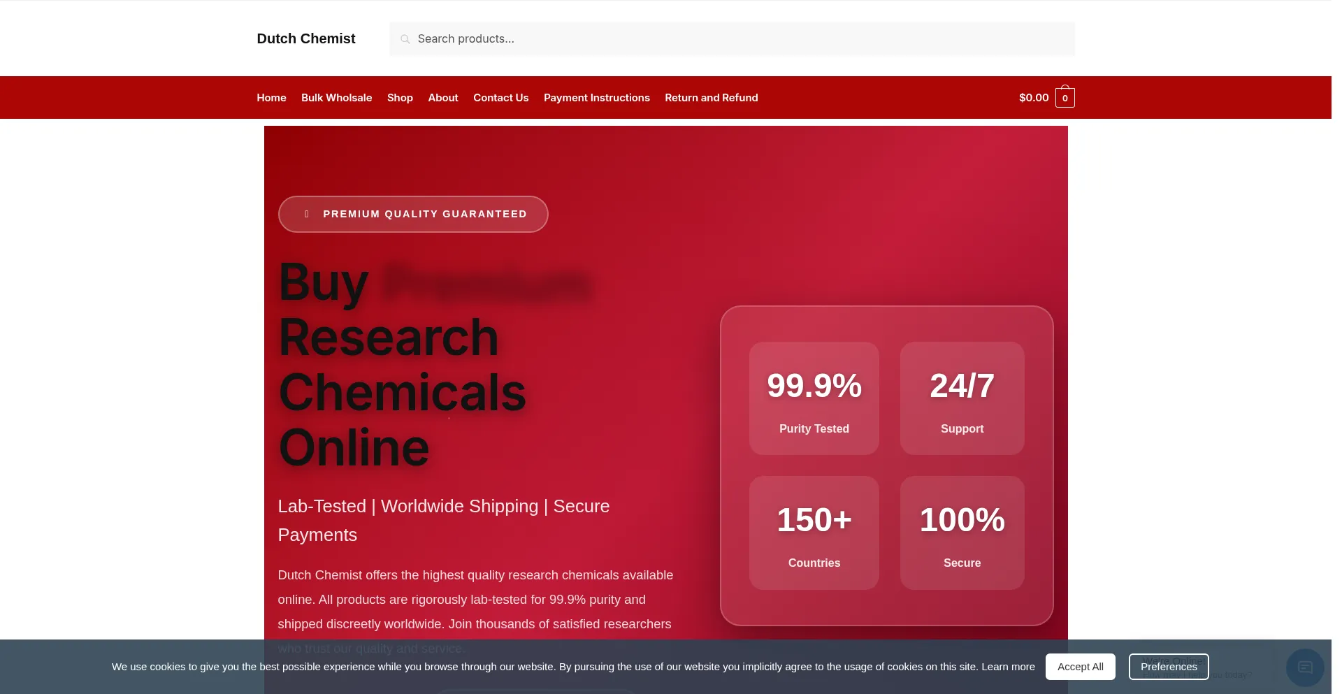 分析表明 dutchchemist.com 作为电子商务平台运营,促进商品或服务的在线交易。该网站实现了购物车功能、支付处理系统和产品目录功能,这些是商业零售运营的典型特征。