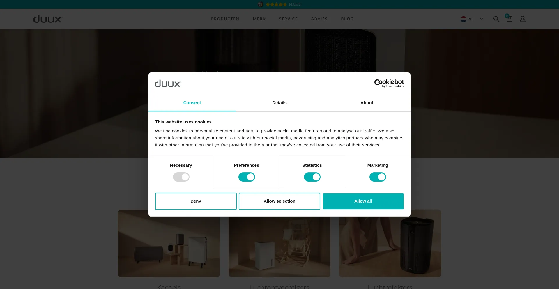 该网站实现符合GDPR或CCPA等隐私法规的cookie同意机制。这表明 duux.com 遵守数据保护标准并为用户提供对个人数据收集实践的控制。