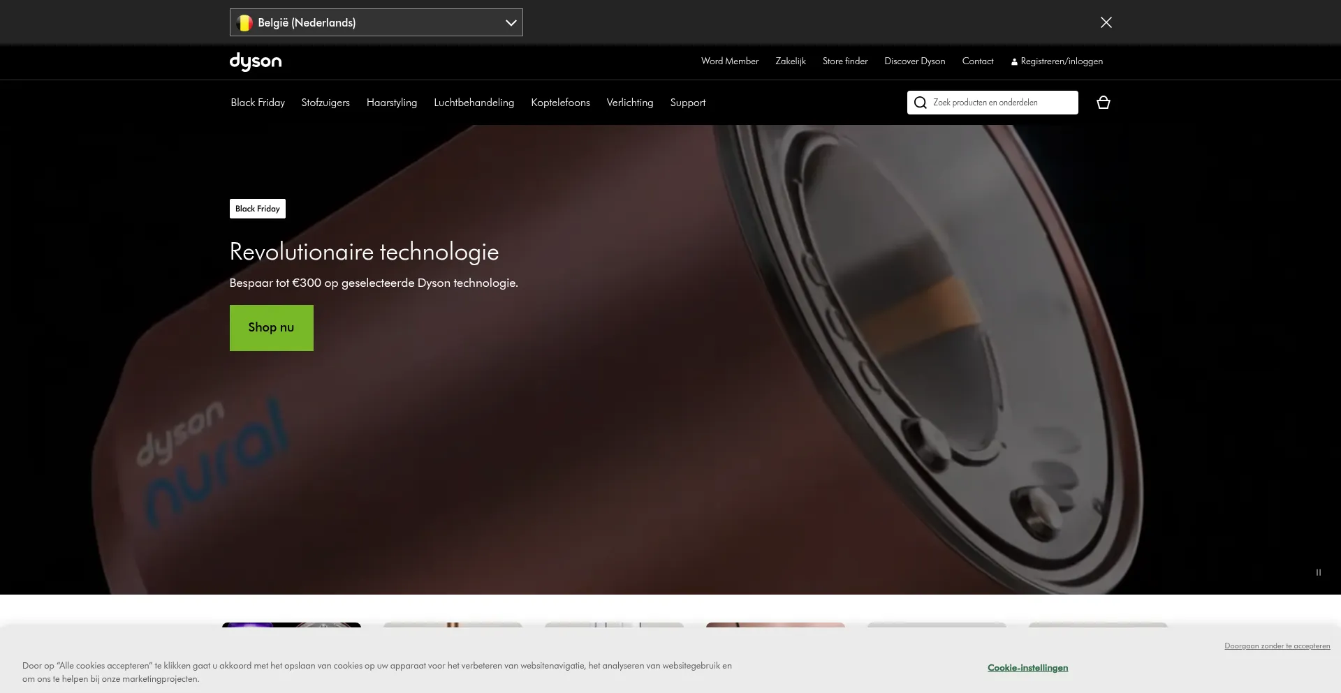 该网站实现符合GDPR或CCPA等隐私法规的cookie同意机制。这表明 dyson.be 遵守数据保护标准并为用户提供对个人数据收集实践的控制。