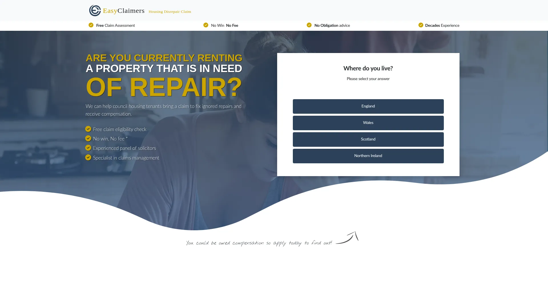 该网站实现数据收集表单,请求个人信息,包括姓名、电子邮件地址、电话号码或其他敏感详细信息。用户应验证 easyclaimers.co.uk 的合法性并在提交个人数据前查看隐私政策。
