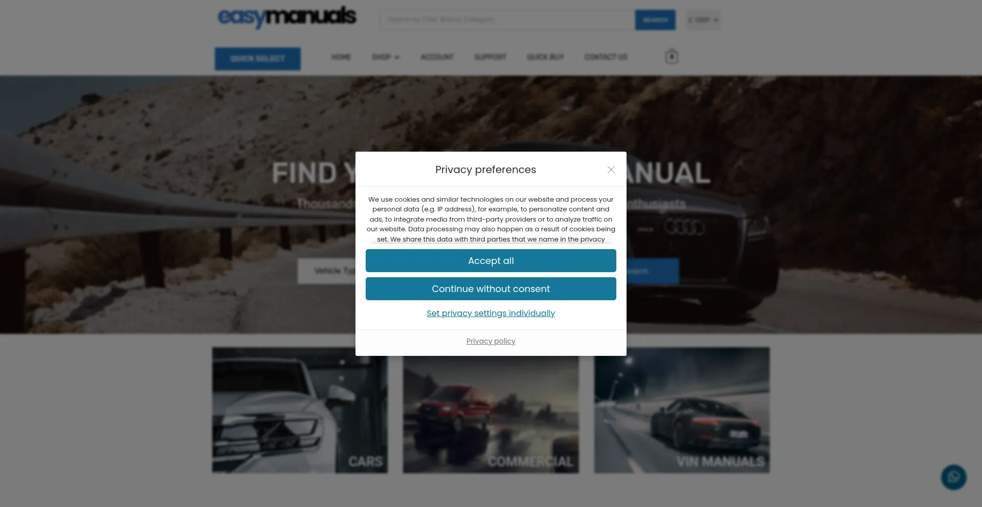 该网站实现符合GDPR或CCPA等隐私法规的cookie同意机制。这表明 easymanuals.co.uk 遵守数据保护标准并为用户提供对个人数据收集实践的控制。