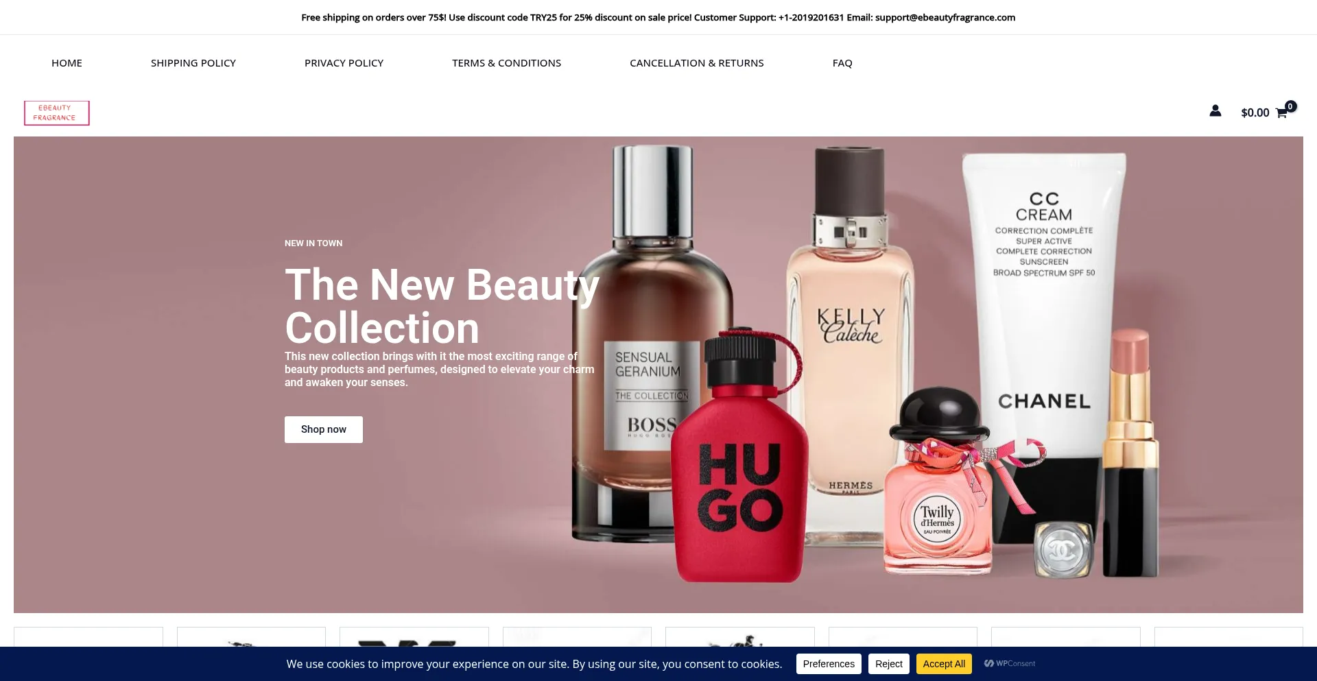 该网站实现数据收集表单,请求个人信息,包括姓名、电子邮件地址、电话号码或其他敏感详细信息。用户应验证 ebeautyfragrance.com 的合法性并在提交个人数据前查看隐私政策。