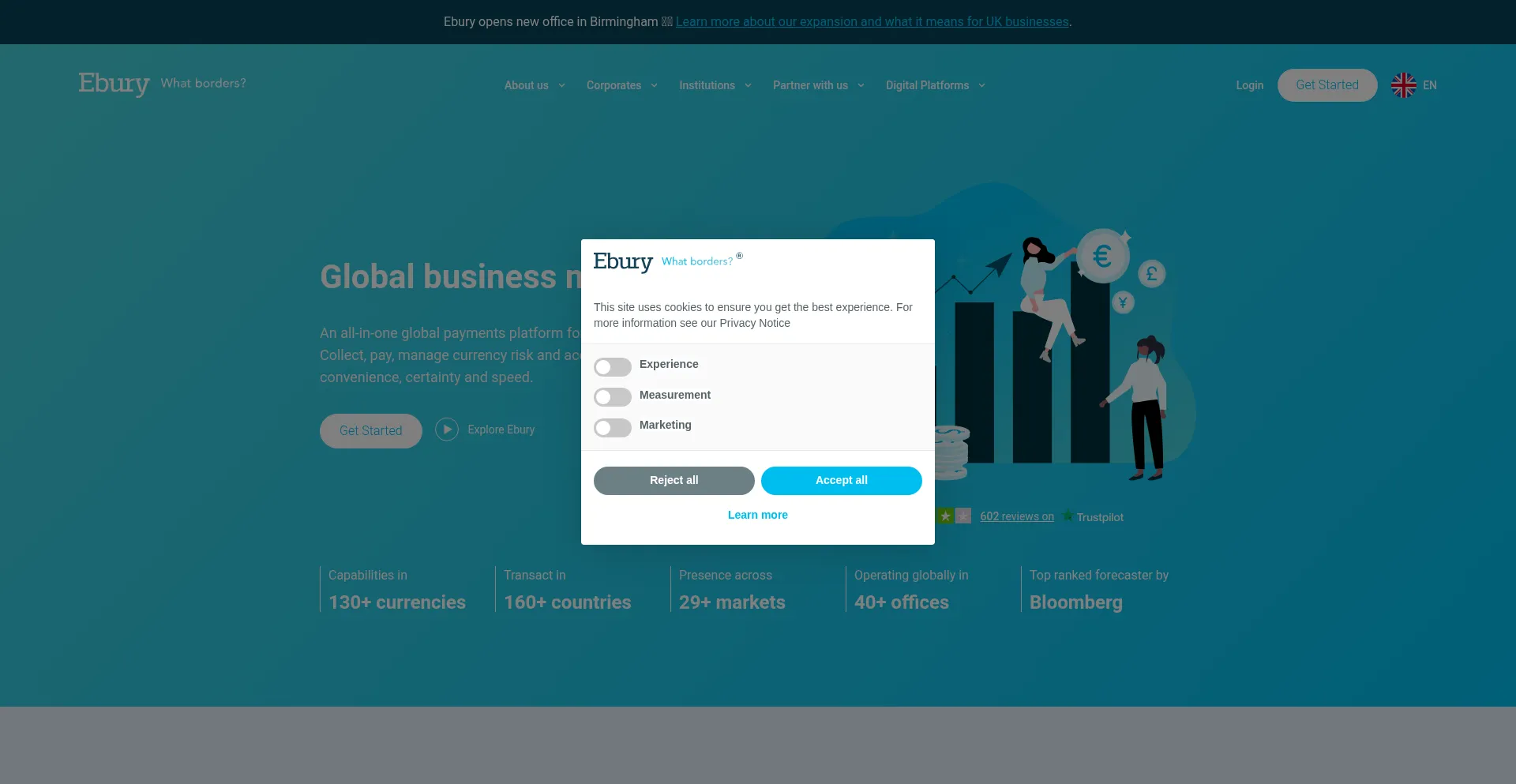 该网站实现数据收集表单,请求个人信息,包括姓名、电子邮件地址、电话号码或其他敏感详细信息。用户应验证 ebury.com 的合法性并在提交个人数据前查看隐私政策。