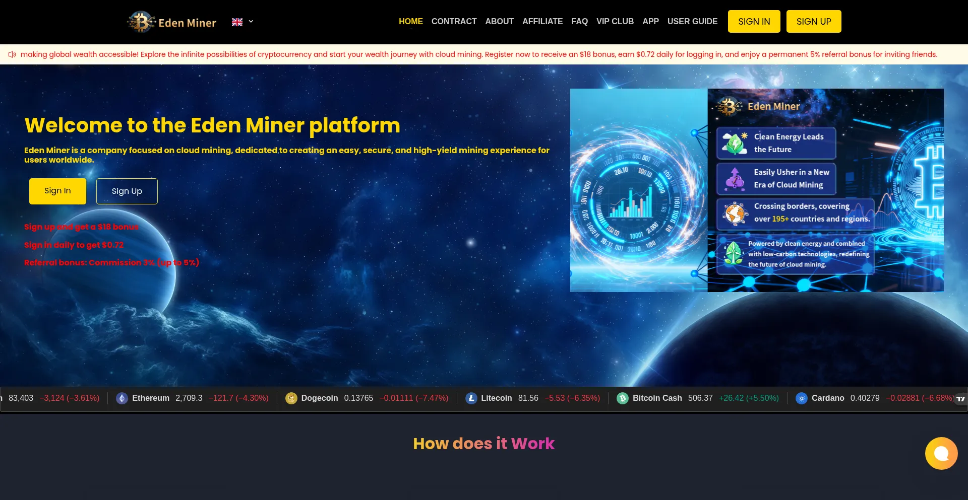 网站 edenminer.com 可能提供云挖矿服务或加密货币挖矿投资。一些平台提供合法的挖矿租赁服务,而其他平台可能使用虚假的挖矿仪表板来显示无法提取的虚拟收益。