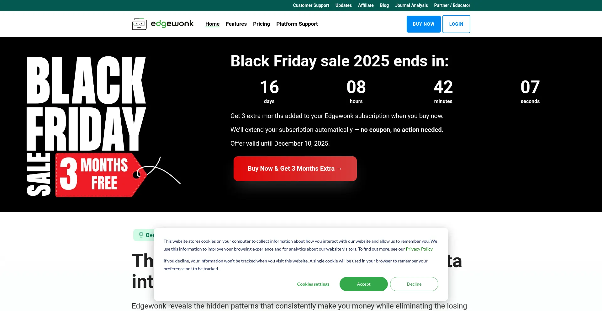 该网站实现符合GDPR或CCPA等隐私法规的cookie同意机制。这表明 edgewonk.com 遵守数据保护标准并为用户提供对个人数据收集实践的控制。