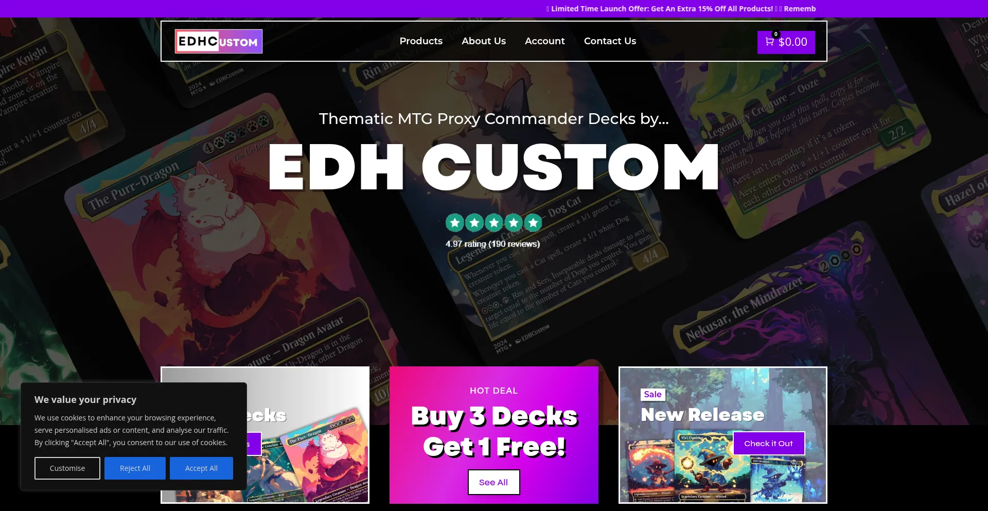 Explore premium quality thematic MTG proxy commander decks. Discover a range of popular themes from chibi to dark fantasy. EDH Custom has you covered!