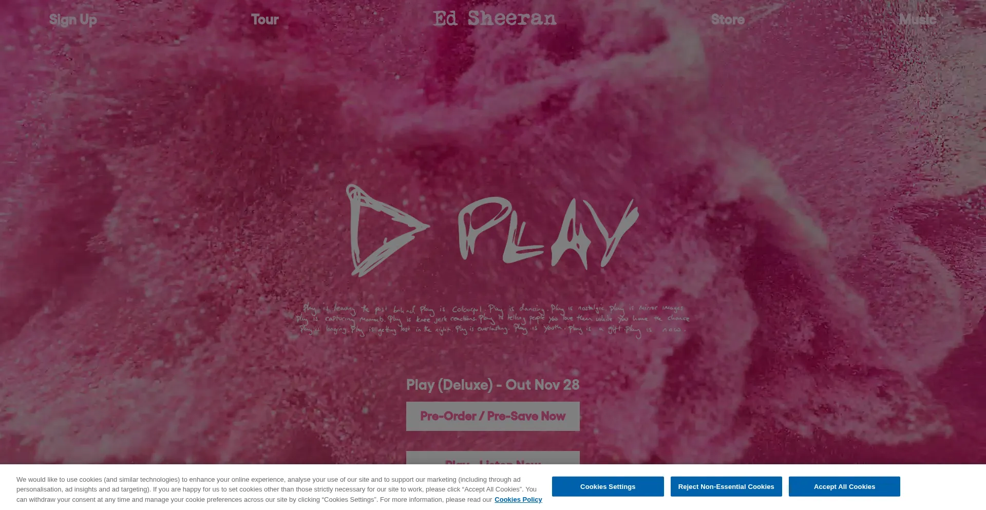 该网站实现符合GDPR或CCPA等隐私法规的cookie同意机制。这表明 edsheeran.com 遵守数据保护标准并为用户提供对个人数据收集实践的控制。