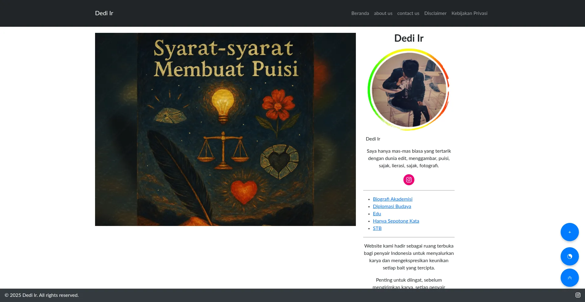Dedi Ir | Saya hanya mas-mas biasa yang tertarik dengan dunia edit, menggambar, puisi, sajak, lierasi, sajak, fotografi.