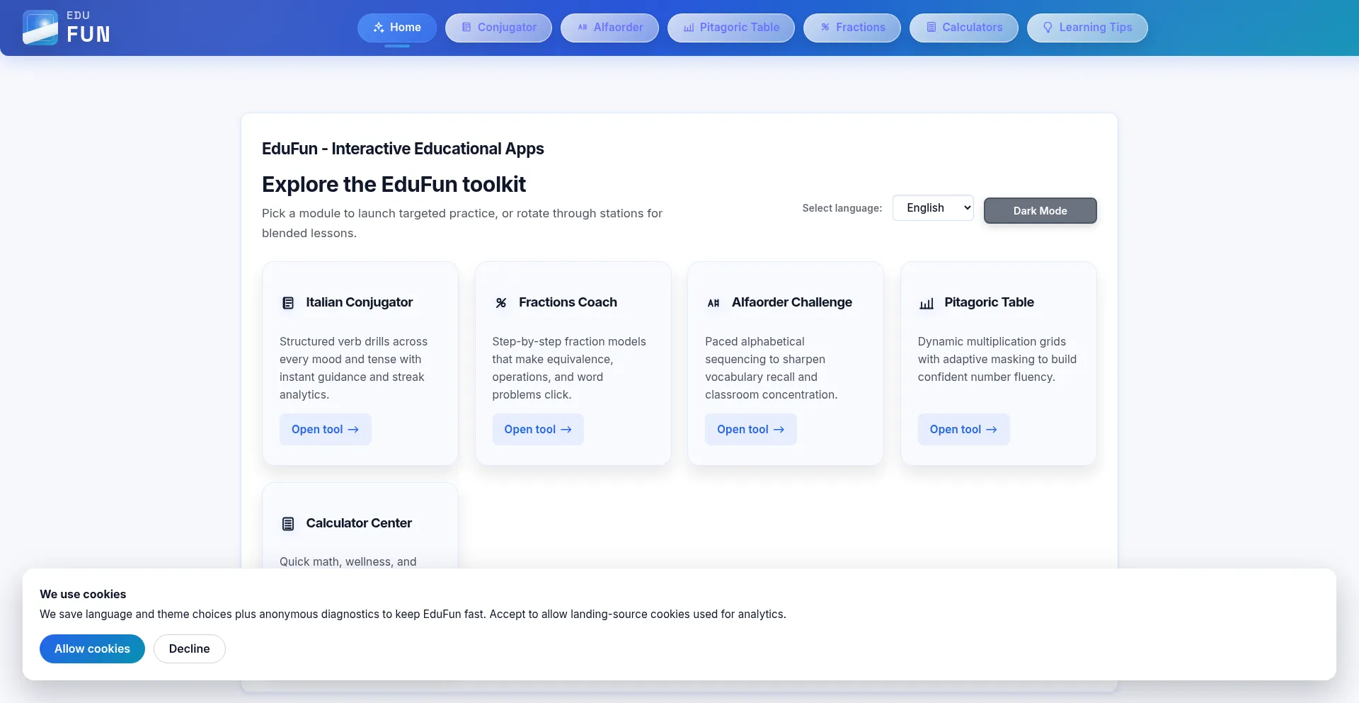 Interactive learning tools: Italian Verb Conjugator, Fractions Coach, Alfaorder Challenge, and Pitagoric Table. Practice with instant feedback.