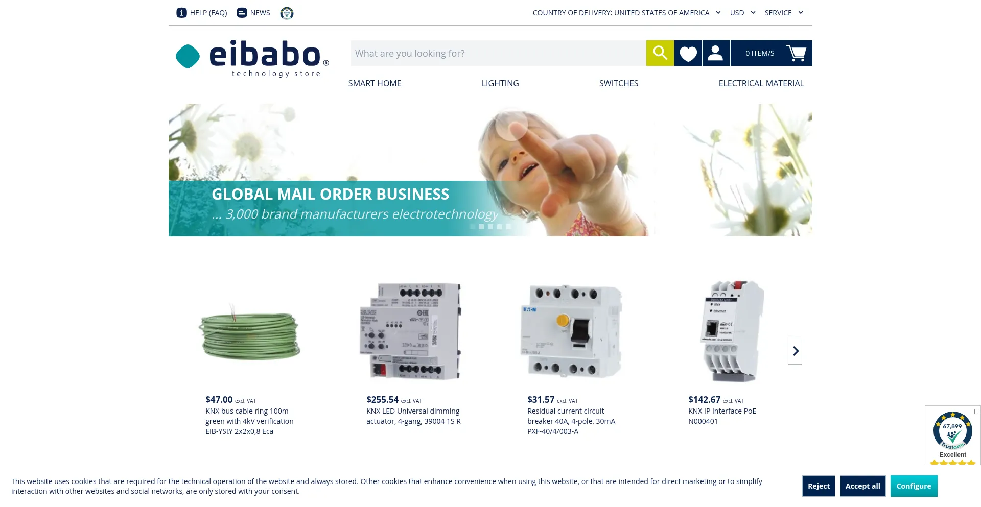 Switches from all top brand manufacturers, lighting (lamps, LEDs, accessories), tools and machines, KNX EIB bus system, radio bus, installation materials and routing systems, ca...
